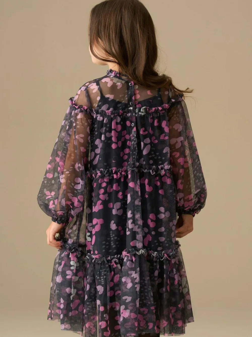 There’s no mesh you won’t love about this dress! A beautiful print in rich inky tones, printed on dreamy diaphanous mesh fabric in a sweeping silhouette. Simply divine. Available in little sister sizes. Machine washable. 100% Polyester.