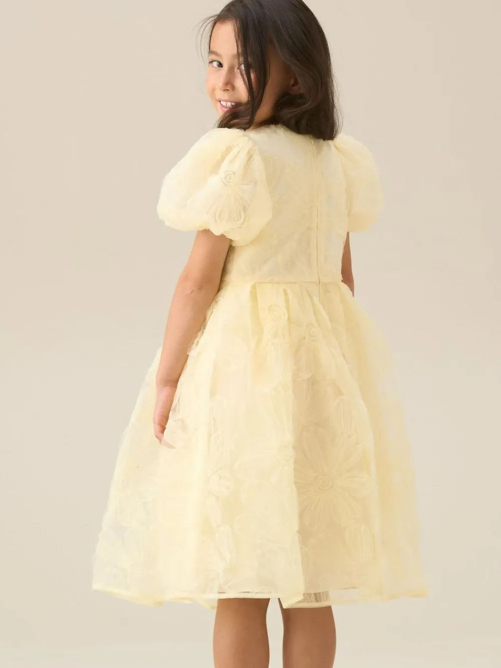 Adorned with delicate mesh flowers and shimmering pink sequins, our Francine dress is made to sparkle with every spin. Puff sleeves add extra-special charm, making it perfect for all those extra-special days. Machine washable. 100% Polyester.