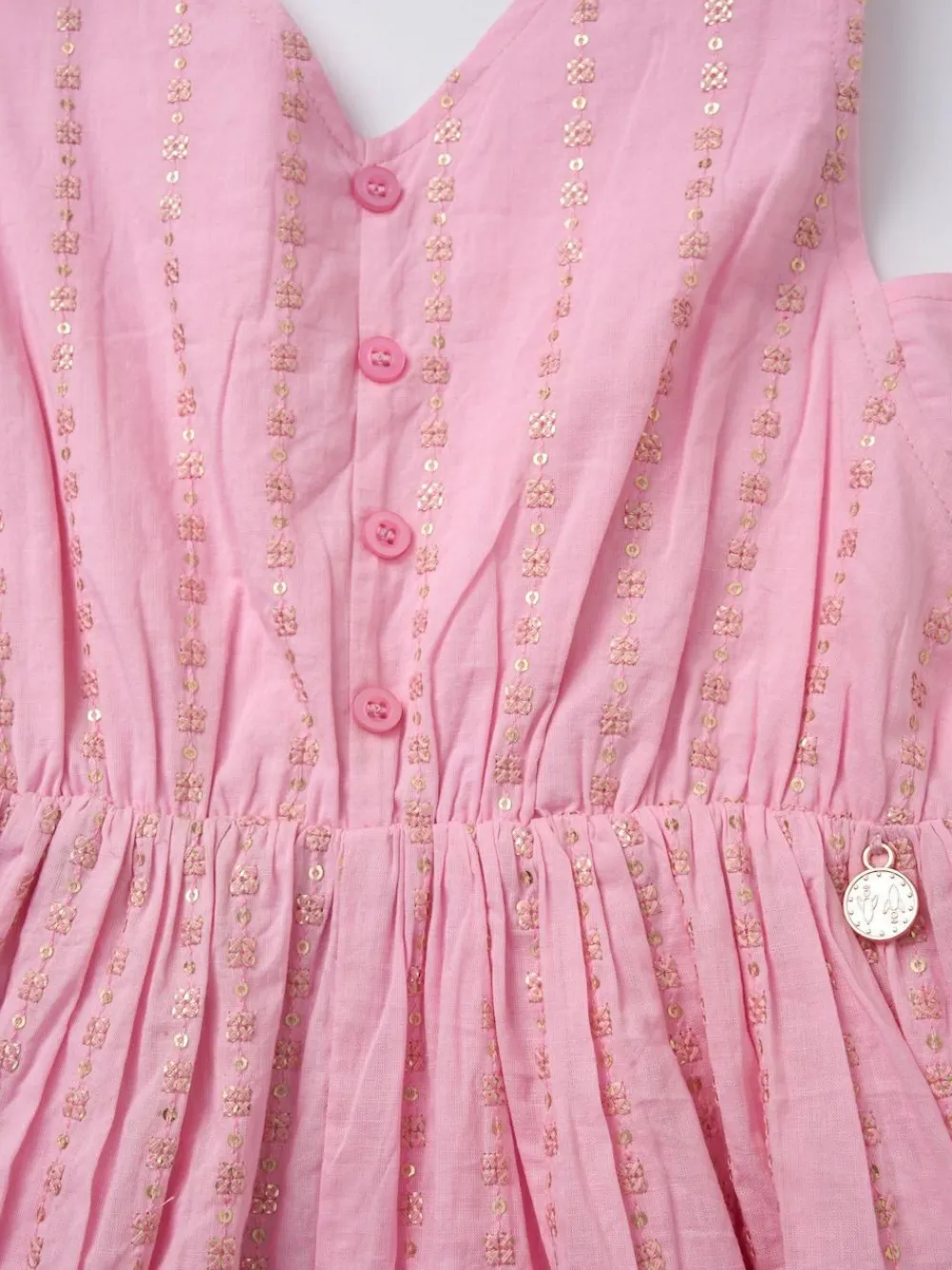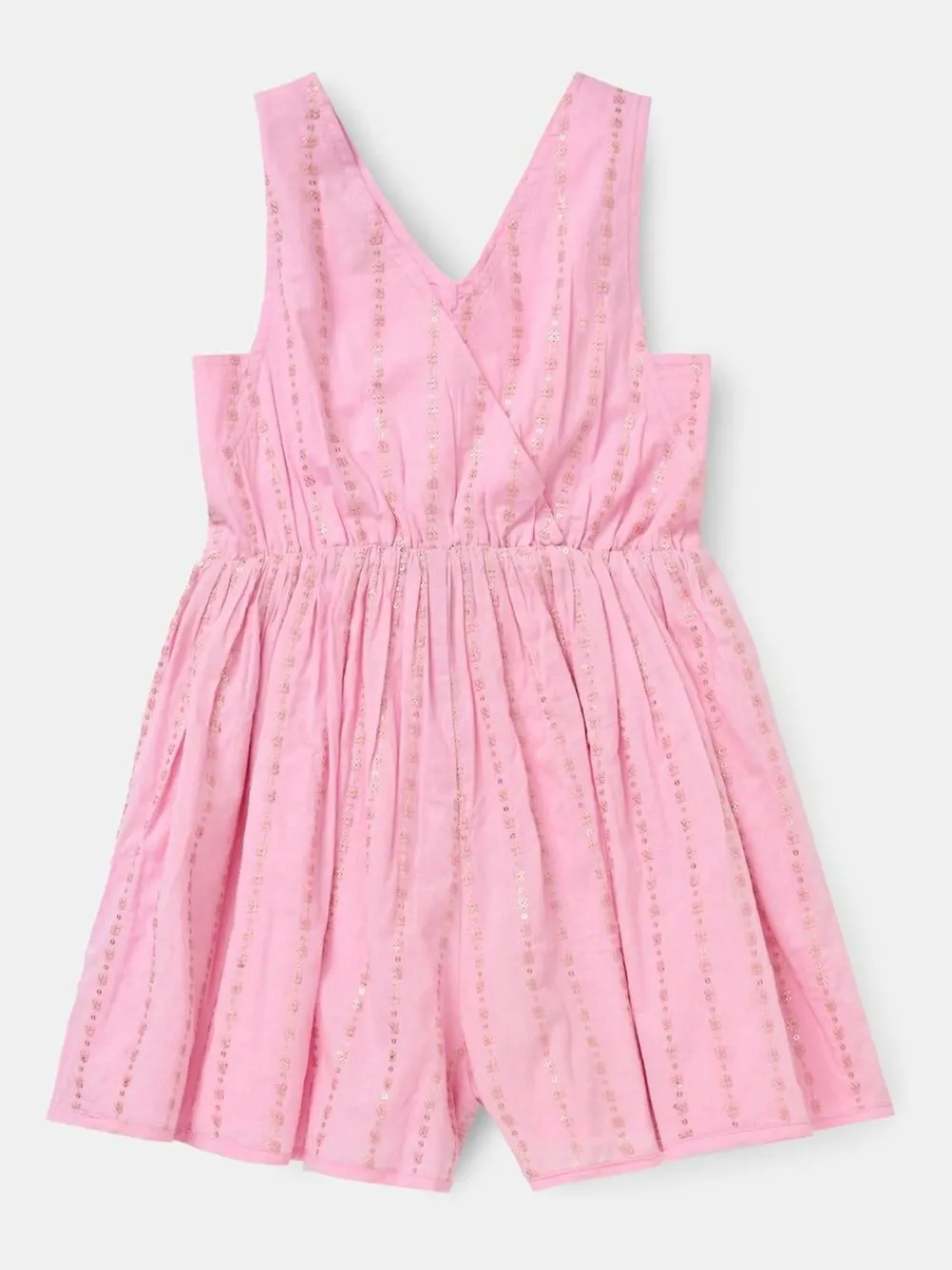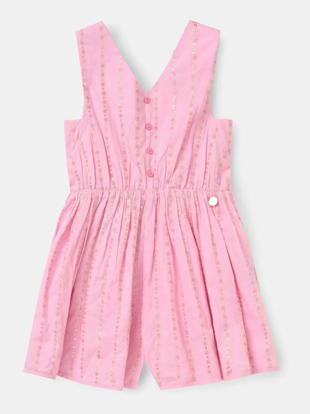 Cue flashbulbs! This embroidered playsuit, crafted from lightweight soft cotton and scattered with pink sequins, is ready to shine. Playful, comfy, and perfect for sunny days and special occasions! Machine washable. 100% Cotton. Warning: Keep away from fire and flames.