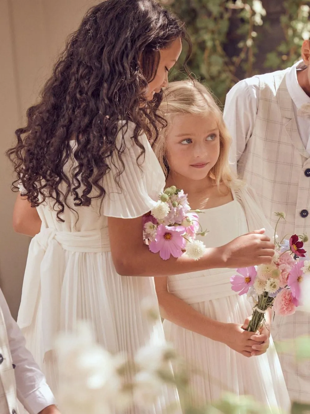 Made for the most special of occasions, this pleated ballerina occasion dress from Angel & Rocket is a classically elegant style. With pleated bodice detailing, fluted angel sleeves and a fabulously floaty skirt that finishes just below the knee. This exquisite style is finished with a sash to the waist which ties in a beautiful bow at the back and delicate button fastenings. Machine washable. 100% Polyester.