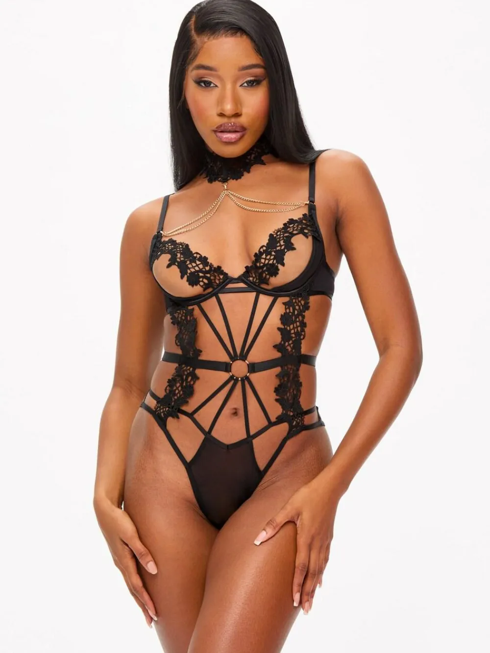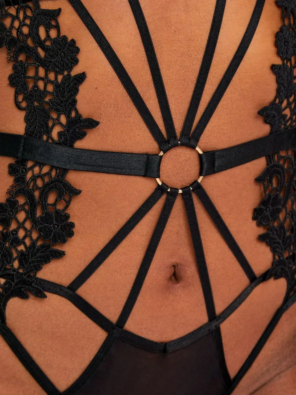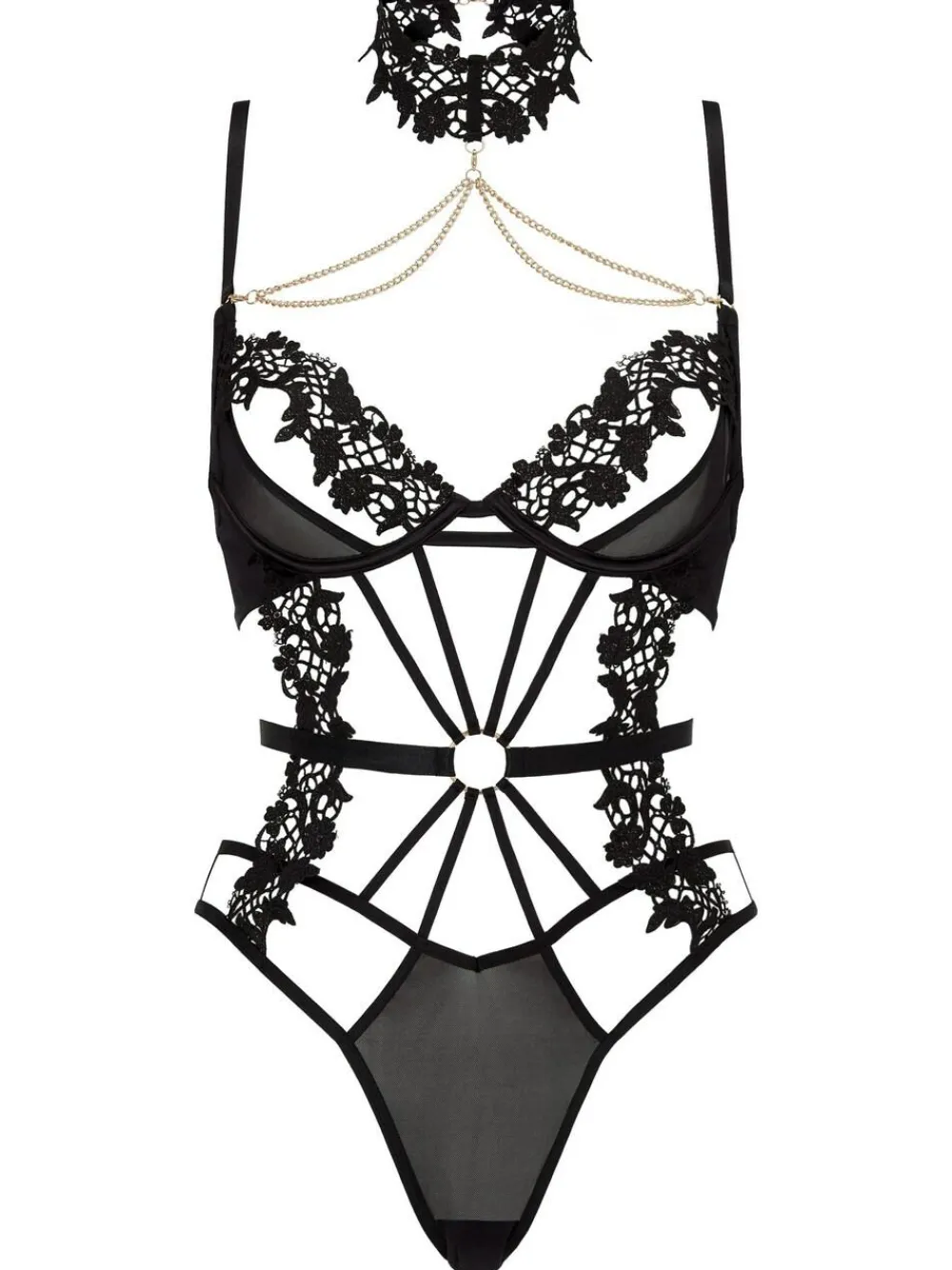 Explore your fantasies in the Evening Desire Crotchless Body. Made from an alluring combination of mesh and floral guipure, it has wired cups and guipure over bust detail. The neck features chain detail that attaches to the apex whilst the waist is decorated with strapping that meets at ring hardware at the centre front. Finished with a Brazilian open bum with a crotchless opening. Slip into yours to set their hearts racing. Hand wash only. Lace 100% Polyester. Mesh 95% Nylon, 5% Elastane. Lining 90% Polyester, 10% Elastane.