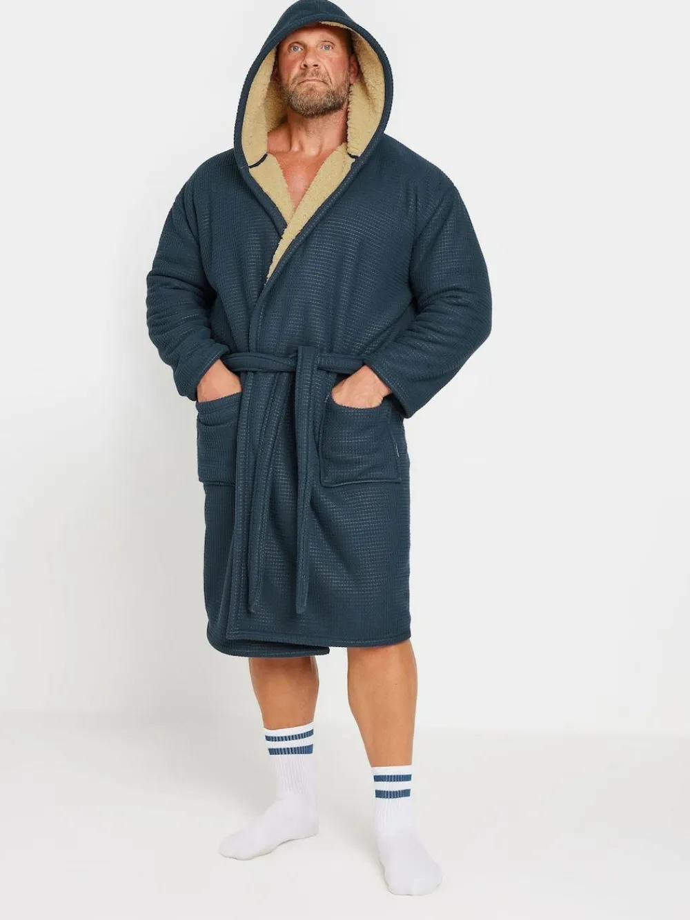 Stay comfortable in the colder weather with this new-in BadRhino dressing gown. Made from a soft woven fabric, it features a waffle texture, borg lining, long sleeves, hooded style, a tie belt, and two pockets. Simply layer over your loungewear. Machine washable. 100% Polyester. Warning: Keep away from fire and flames.