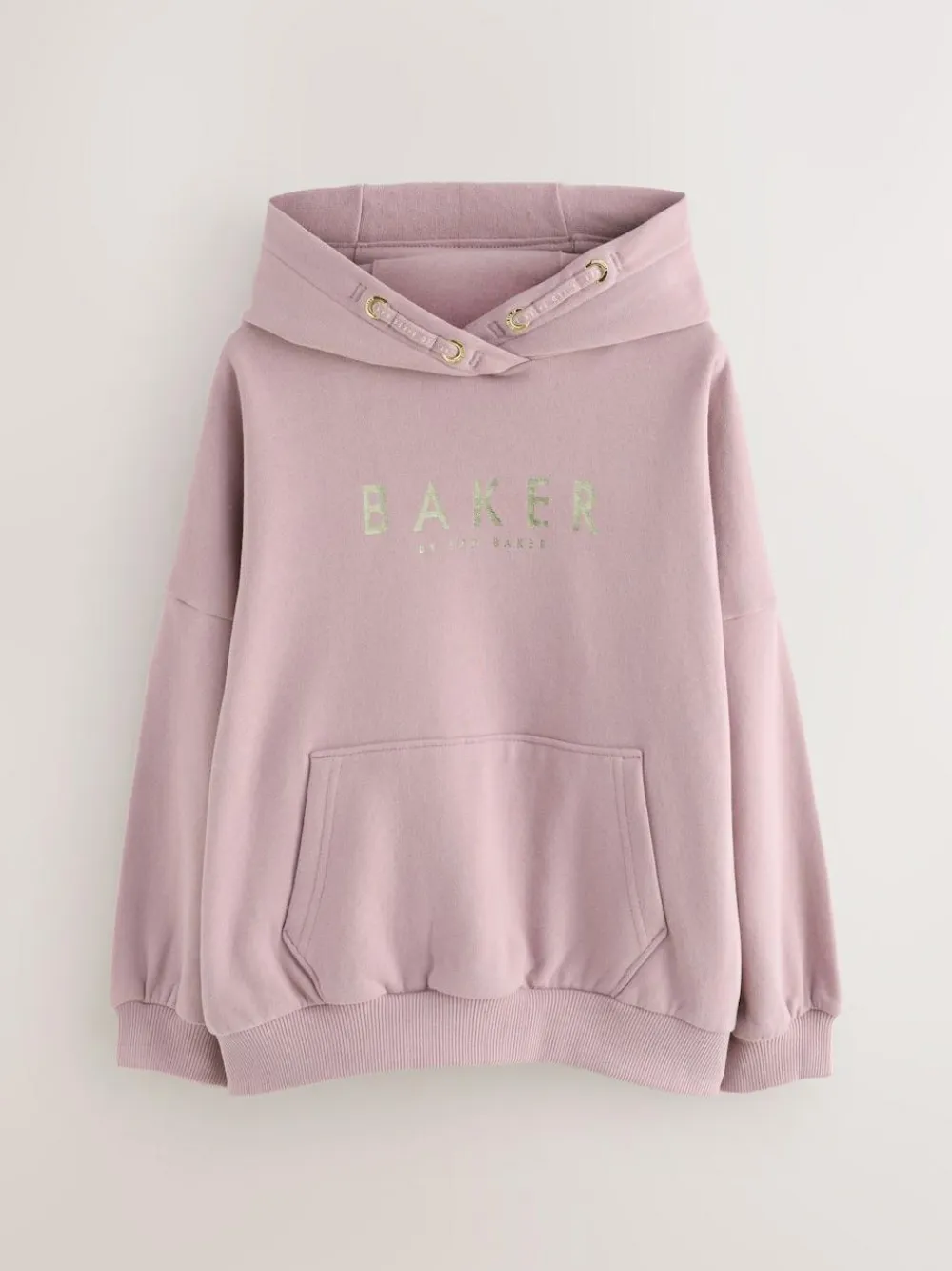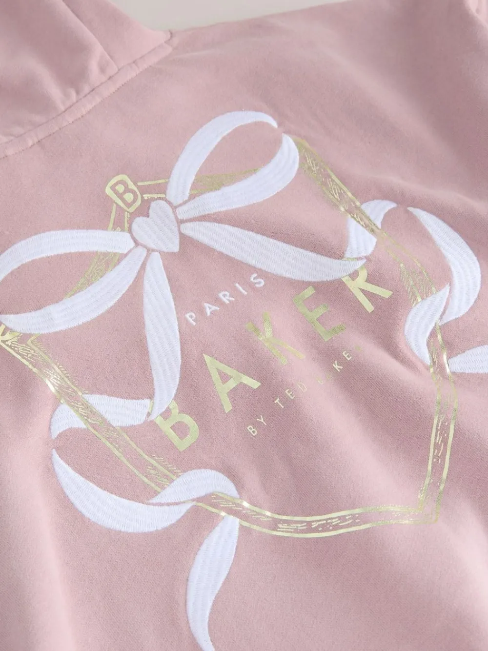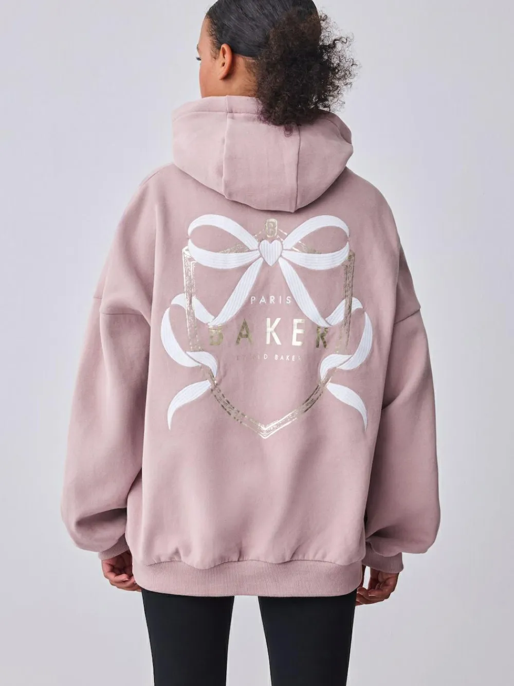 Cute and comfort combined in this back print branded hoodie from Baker by Ted Baker. This piece comes in a soft brushback fabric with ribbed cuffs and hem, with easy stretch for an oversized fit. The hoodie boasts a beautiful bow and shield graphic on the front and back on a gorgeous soft mauve colour. Easy to pair with flares or jeans, this is a perfect wardrobe staple for your girl. Oversized fit Soft brushback fabric Baker printed branding 93% Cotton, 7% Recycled polyester.