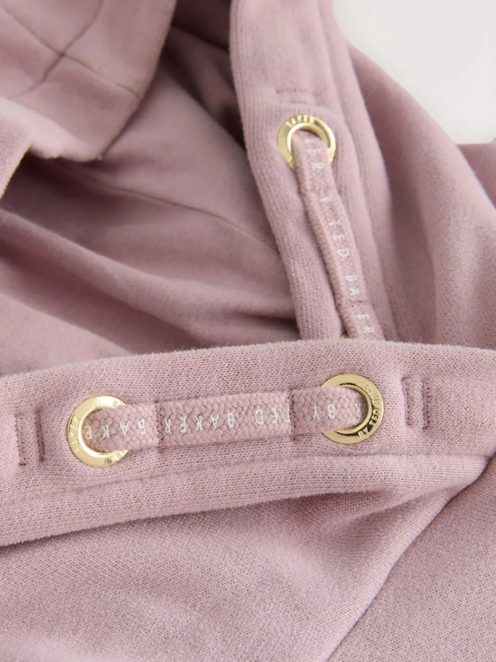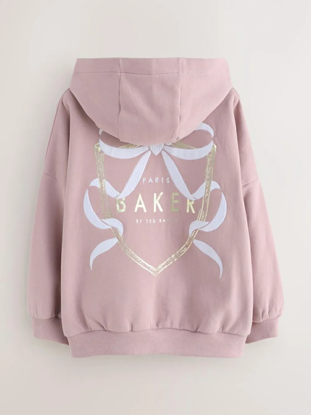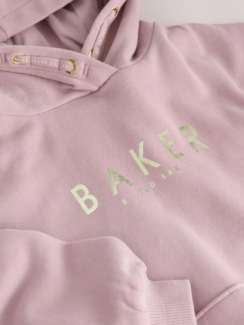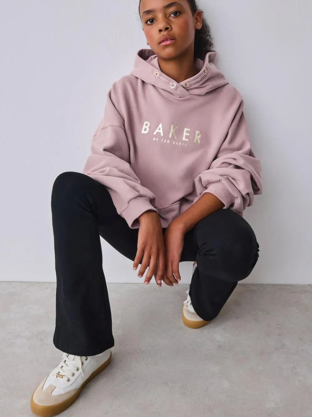 Cute and comfort combined in this back print branded hoodie from Baker by Ted Baker. This piece comes in a soft brushback fabric with ribbed cuffs and hem, with easy stretch for an oversized fit. The hoodie boasts a beautiful bow and shield graphic on the front and back on a gorgeous soft mauve colour. Easy to pair with flares or jeans, this is a perfect wardrobe staple for your girl. Oversized fit Soft brushback fabric Baker printed branding 93% Cotton, 7% Recycled polyester.