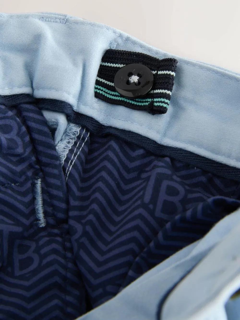 Dress him up in charming style with the Baker by Ted Baker Shirt Trousers and Braces Set. This dapper four-piece outfit features a crisp short sleeve shirt paired with stylish light blue chino style trousers that include a smart cuffed hem and practical pockets. The look is completed with a matching blue bow tie and cool detachable branded braces for ultimate versatility. Signature details include branded tape on the trouser pockets and subtle printed branding on the back pocket, ensuring a smart finish perfect for parties, weddings or any special occasion. 4 piece set Detachable branded braces Branded back pocket Perfect for an occasion Shirt 55% Linen, 45% Cotton. Trouser and Bow Tie 98% Cotton, 2% Elastane.