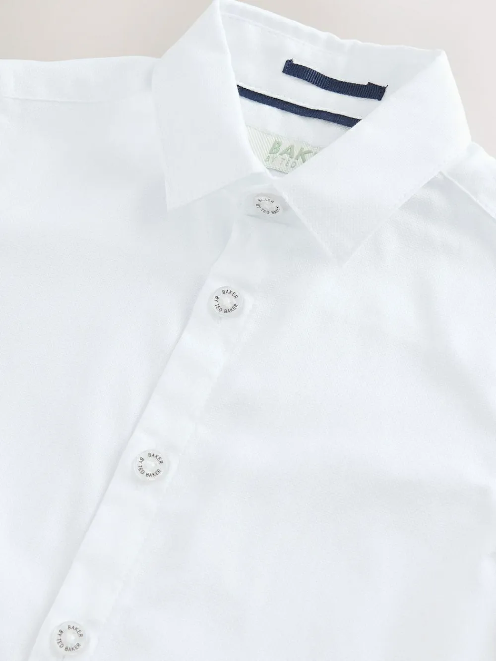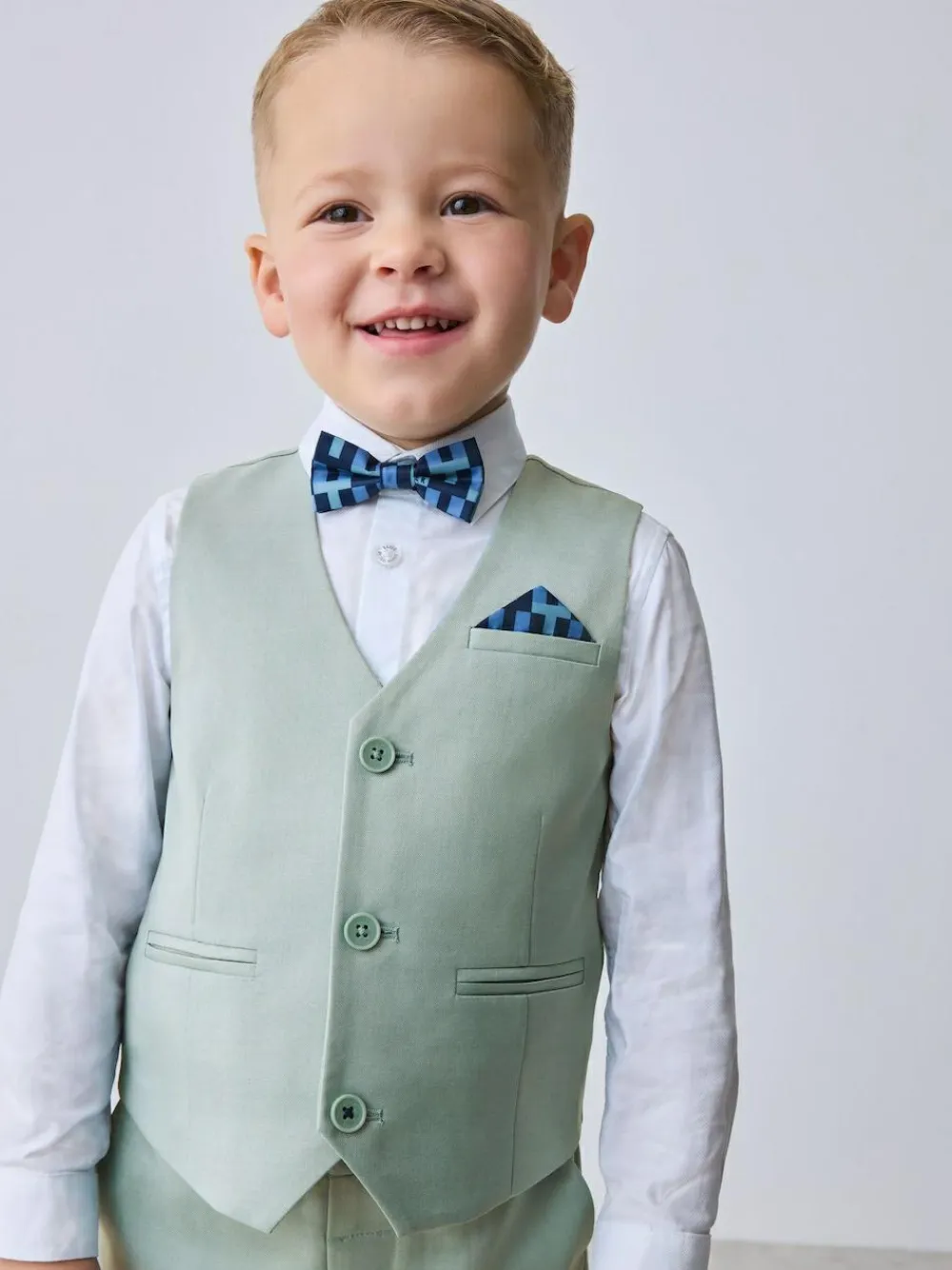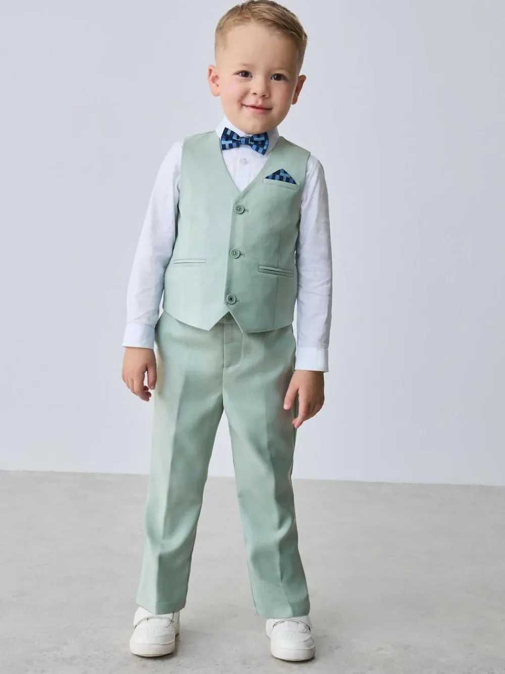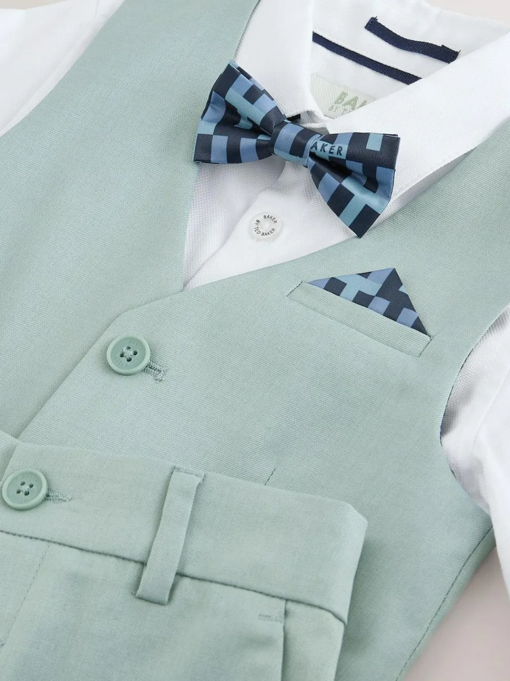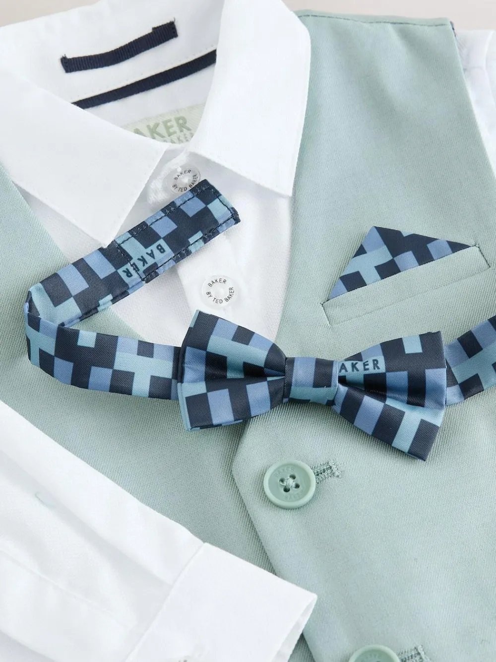 Dress up your little man in style with this adorable outfit from Baker by Ted Baker. The three-piece set is perfect for all of his special occasions and includes a waistcoat, trousers and they come with a classic white sleeve shirt The waistcoat has false pockets and branded button fastenings down the front. The trousers have a traditional button and elasticated waist for a comfortable fit. The whole look is finished with a printed cute bow tie and pocket sqaure. Add some smart shoes and he will be the best-dressed guest. Shirt 100% Cotton. Waistcoat Main 98% Polyester, 2% Elastane. Lining 100% Polyester. Trouser 98% Polyester, 2% Elastane. Bow Tie 100% Polyester.
