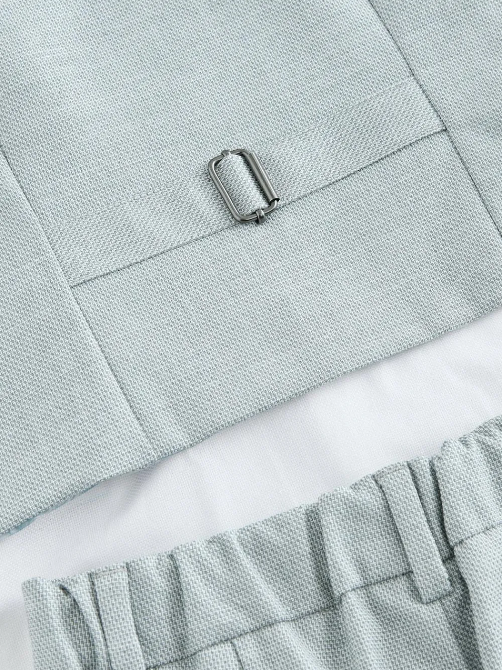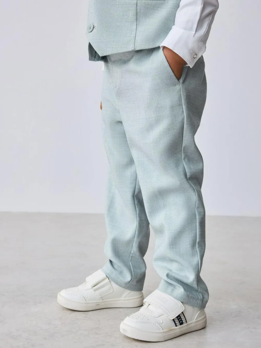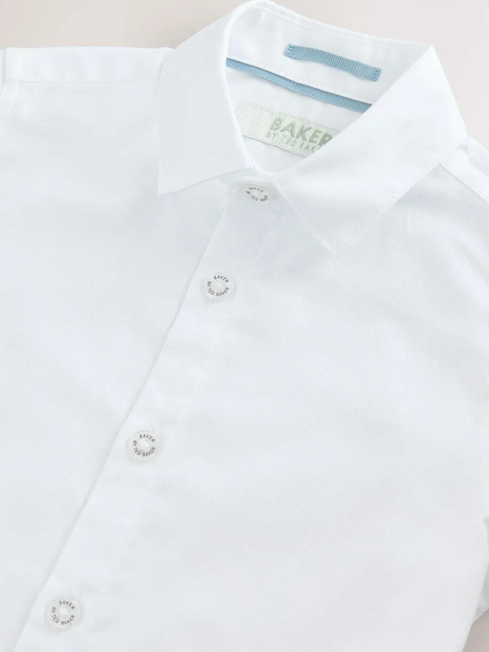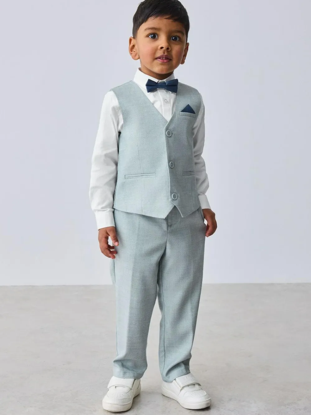 Dress up your little man in style with this adorable outfit from Baker by Ted Baker. The three-piece set is perfect for all of his special occasions and includes a waistcoat, trousers and they come with a classic white sleeve shirt The waistcoat has false pockets and branded button fastenings down the front. The trousers have a traditional button and elasticated waist for a comfortable fit. The whole look is finished with a printed cute bow tie and pocket sqaure. Add some smart shoes and he will be the best-dressed guest. Shirt 100% Cotton. Waistcoat Main 85% Polyester, 13% Viscose, 2% Elastane. Lining 100% Polyester. Trouser 85% Polyester, 13% Viscose, 2% Elastane. Bow Tie 100% Polyester.