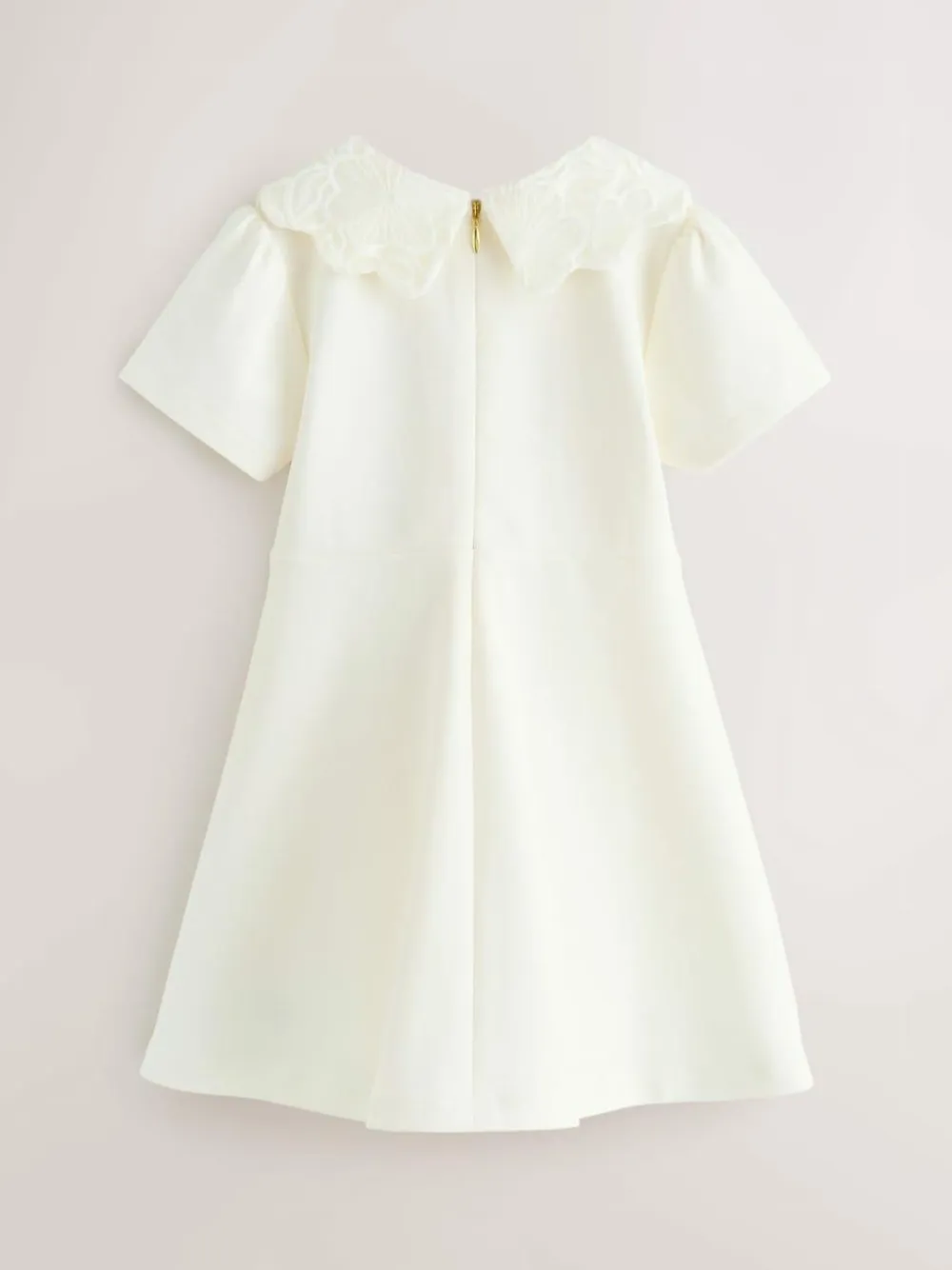 A timeless piece perfect for any cherished event. This exquisite dress is crafted in a soft ponte fabric in a rich cream tone, with a soft structure that ensures a graceful drape. The defining feature is the scalloped collar, intricately detailed with delicate lace embroidery. The dress is finished with our Baker branded gold-tone heart buttons down the bodice. With its gentle A-line cut and sophisticated short sleeves, this dress is designed to be an heirloom piece. 95% Cotton, 5% Elastane.