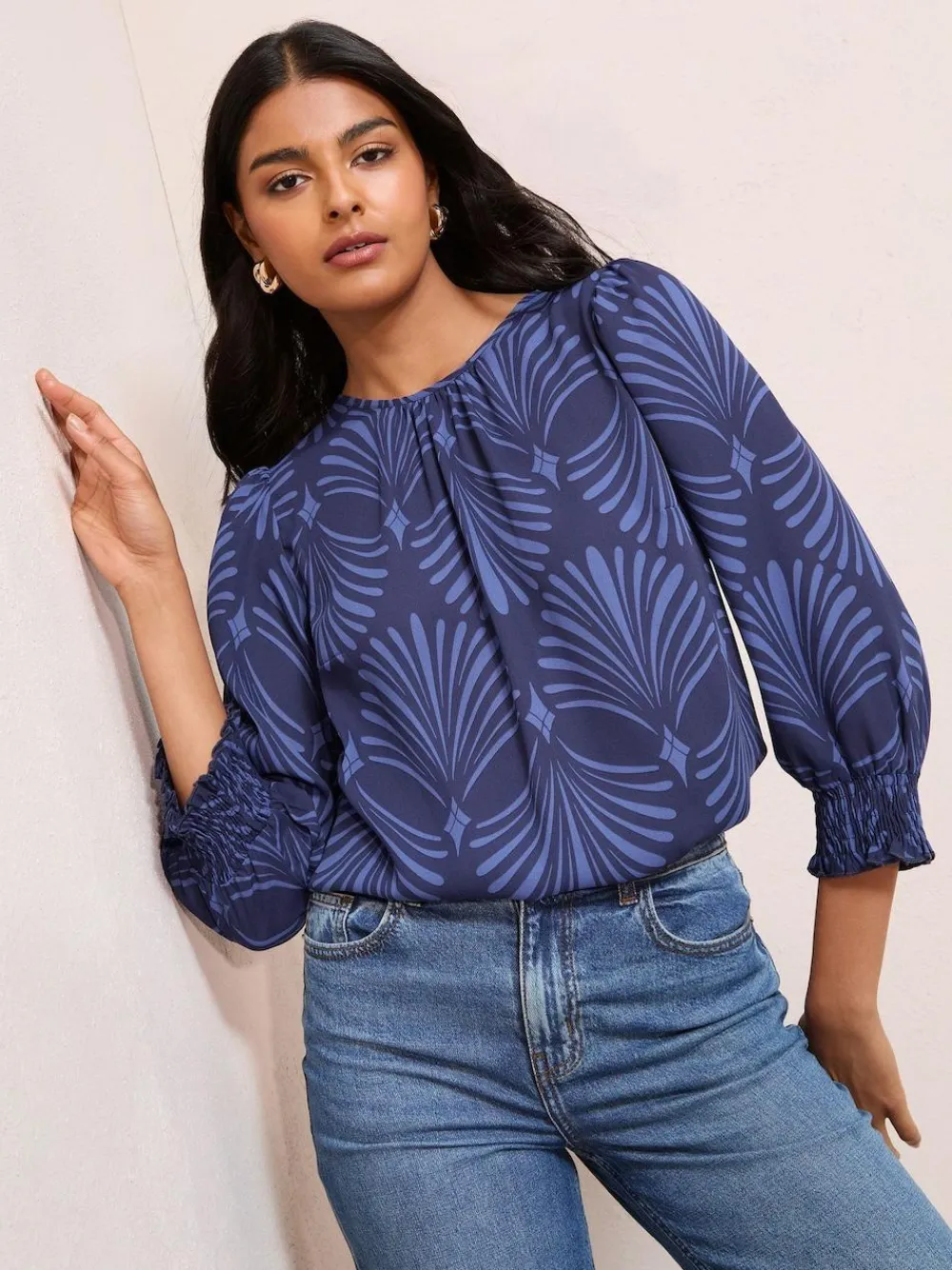 Best Friends Like These 3/4 Sleeve Shirred Cuff Blouse Blue Fan Print