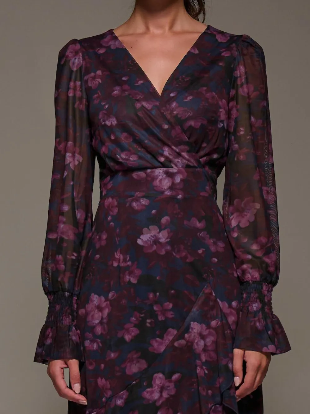 Long Sleeve Ruffle Hem Mesh Maxi Dress by Jolie Moi features long sleeves with shirred wrists that naturally flare out. The V-Neckline and wrap-style front enhance the flattering silhouette, while the belt cinches the waist. The three-tiered ruffle hemline is slightly shorter in the front so the dress sways beautifully as you walk. Machine washable. 95% Polyester, 5% Elastane.