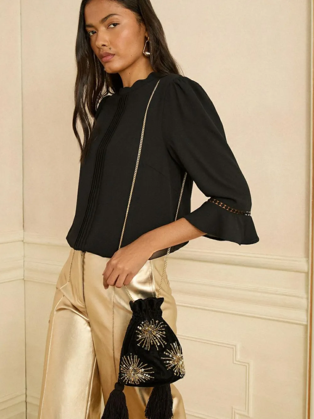 Best Love & Roses Velvet Sequin Embellished Pouch Bag Black