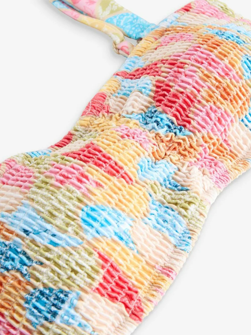Keep it colourful in this bright shirred bikini top from Never Full Dressed. Adorned in vibrant hues to spread the summer spirit, this bikini top is designed with elasticated shirred detailing for a comfy fit and adjustable straps. Pair with the matching bikini briefs for a complete set. Shirred design Adjustable straps Matching bikini bottoms available Machine washable. Main 84% Nylon, 16% Elastane. Lining 92% Recycled polyester, 8% Elastane.