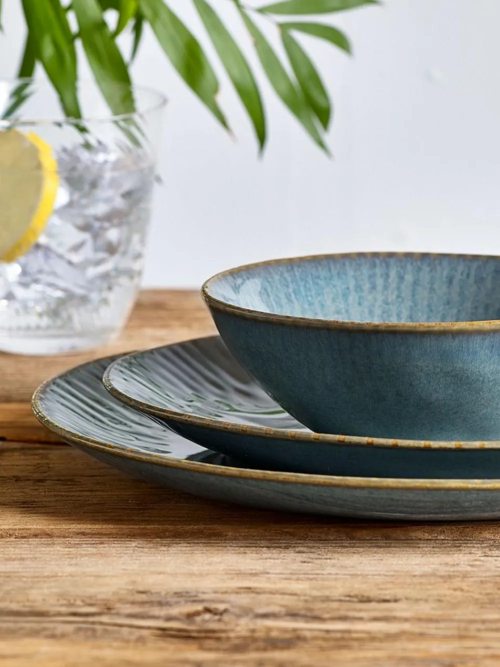 Made in Portugal, our Collins dinner set comprises 4 dinner plates, 4 side plates and 4 bowls, all in a beautiful, unique reactive glaze. In a rich, teal blue colour, the way the glaze is applied to each piece in this set creates the stunning border detail that has a feather like feel. Each plate and bowl also has a slightly darker rim, giving them that authentic feel. The perfect way to elevate your meal times, this set will be sure to add interest to your table. Each piece in this set is entirely unique due to the reactive nature of the glaze used to create the border pattern. Made from durable stoneware which is both practical and long lasting. 12-piece set Made in Portugal Teal blue Border detail Dinner plate diameter 27cm Side plate diameter 23cm Bowl diameter 15.5cm 4 x Dinner Plate and 4 x Bowl 100% Stoneware. 4 x Side Plate 0% Stoneware. Dishwasher safe, microwaveable.