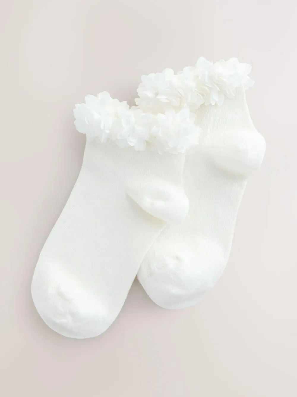 This pretty 2 pack of ivory cream cotton rich socks are ankle length. Featuring a pretty flower trim around the top of the welt. Perfect for pairing with bridesmaid shoes or a dress. Biome treatment has been applied to sizes 6-8.5 upwards to keep the feet feeling fresh for longer. 2-pack Cotton-rich Flower trim Machine washable. 2 x Socks 75% Cotton, 23% Nylon, 2% Lycra® Elastane.