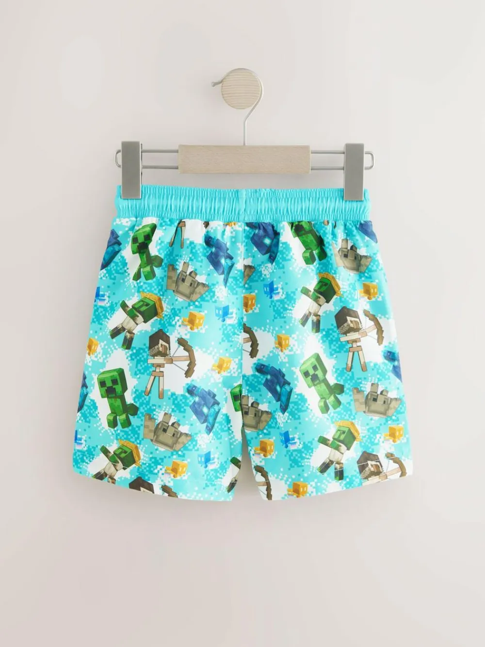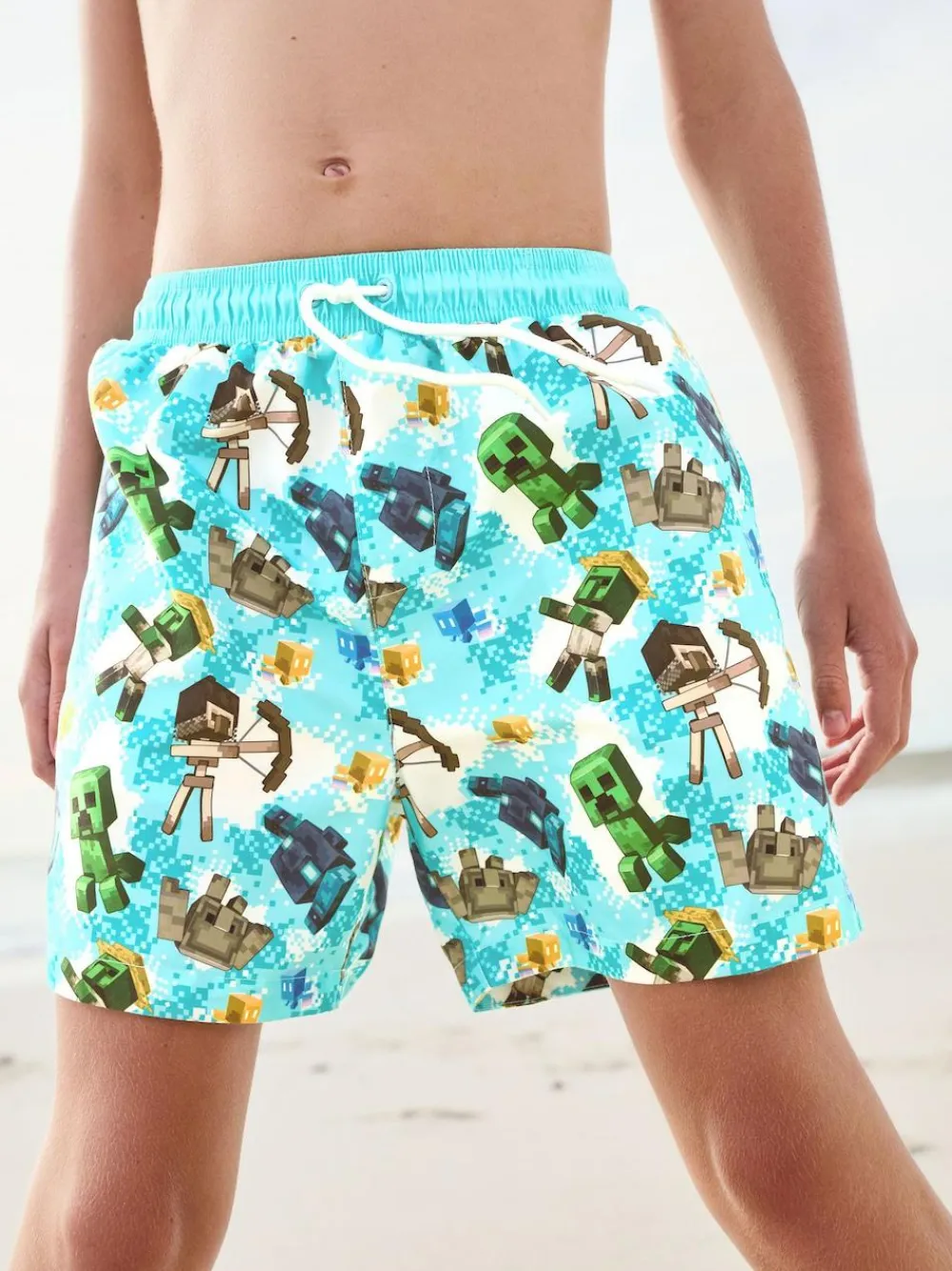 Get them ready for a holiday in the sun with these light blue swim shorts, featuring an officially licensed Minecraft all-over print. The swim shorts have an elasticated waistband with an adjustable drawstring, finished with pockets and a mesh lining. Swim shorts Minecraft print Elasticated waistband Adjustable drawstring Side pockets Machine washable. Main 100% Recycled polyester. Lining 100% Recycled polyester.
