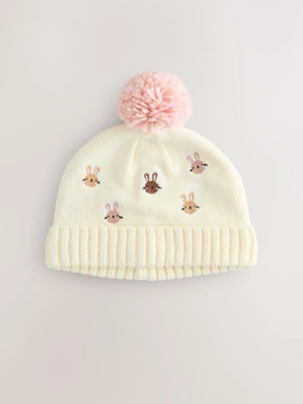 Best Next Pink/Cream Embroidered Bunny Character Pom Knitted Hat (0mths-2yrs)