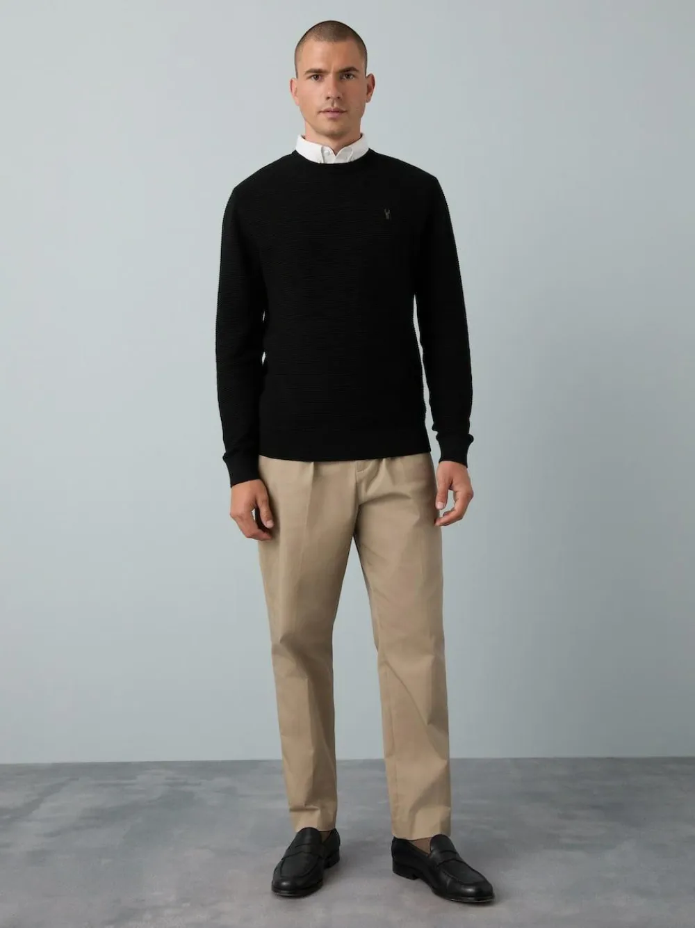 Perfect for a smart-casual look, this crew-neck textured jumper in black is a versatile wardrobe staple. The comfortable, cotton-rich fabric provides all-day comfort, while the mock, white, Oxford shirt-collar detail offers the illusion of a layered look with minimal effort.Crew neck Cotton rich Oxford mock shirt detail Machine washable. Main 86% Cotton, 14% Nylon. Collar 100% Cotton.