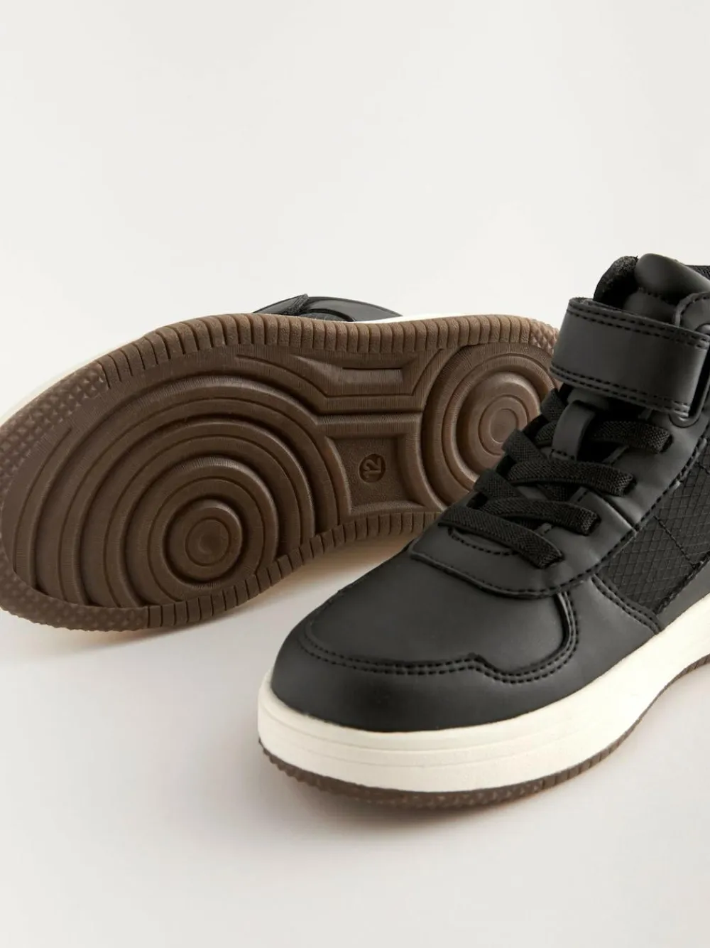 These sporty black high-top trainers have a versatile design that can be worn with smart-casual or everyday outfits, featuring a faux leather and textile upper with a lace-up and touch fastening. A textile lining keeps things breathable, finished with a durable and chunky outsole. High-top Lace-up and touch fastening Faux leather and textile upper Textile lining Durable outsole Upper – Other Materials, Textile, Lining & Sock – Textile, Sole – Other Materials.
