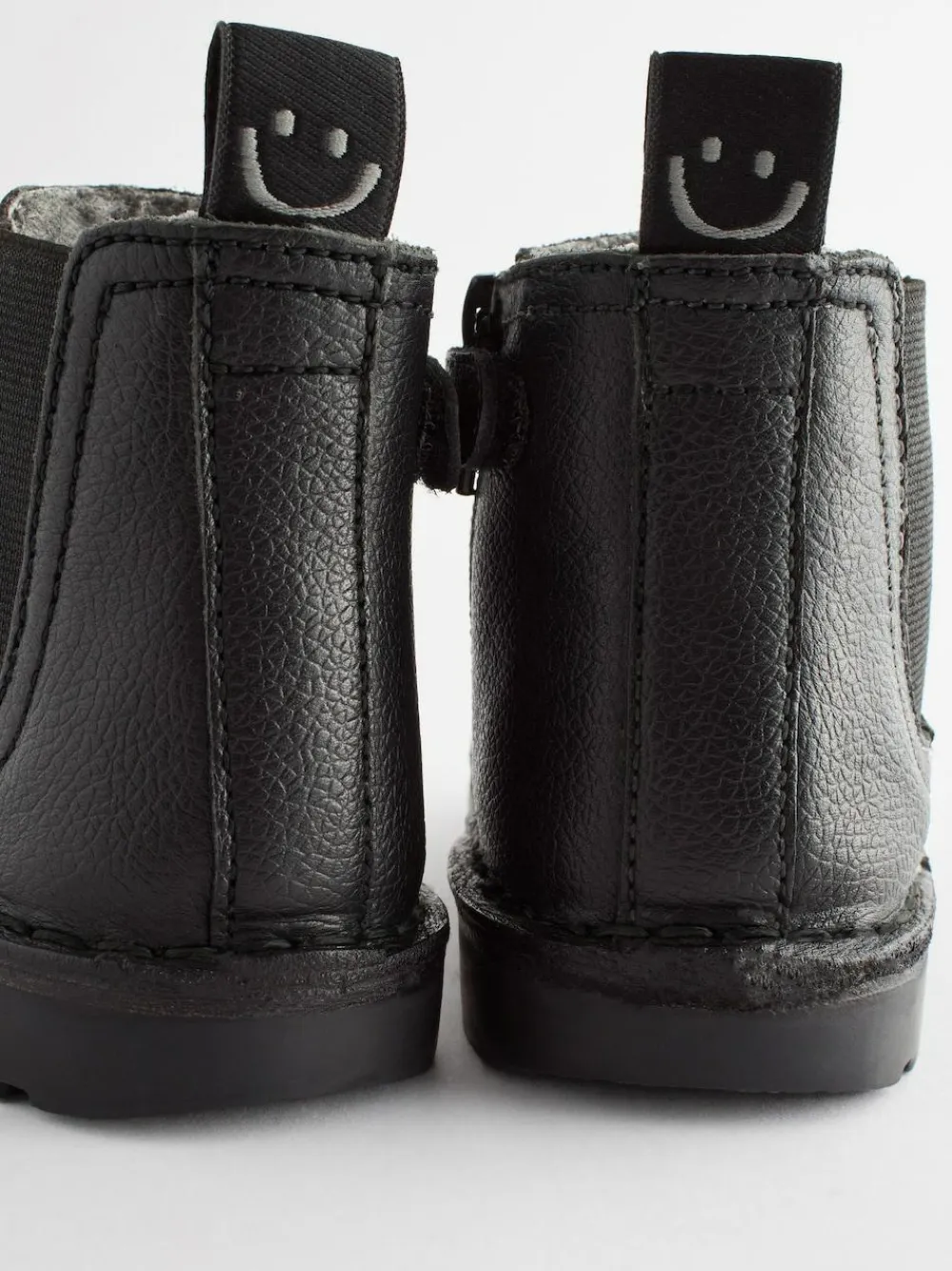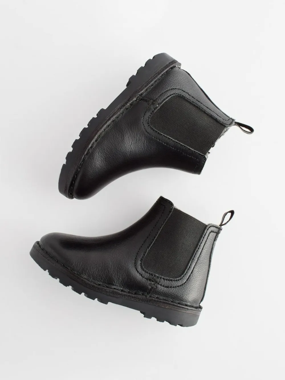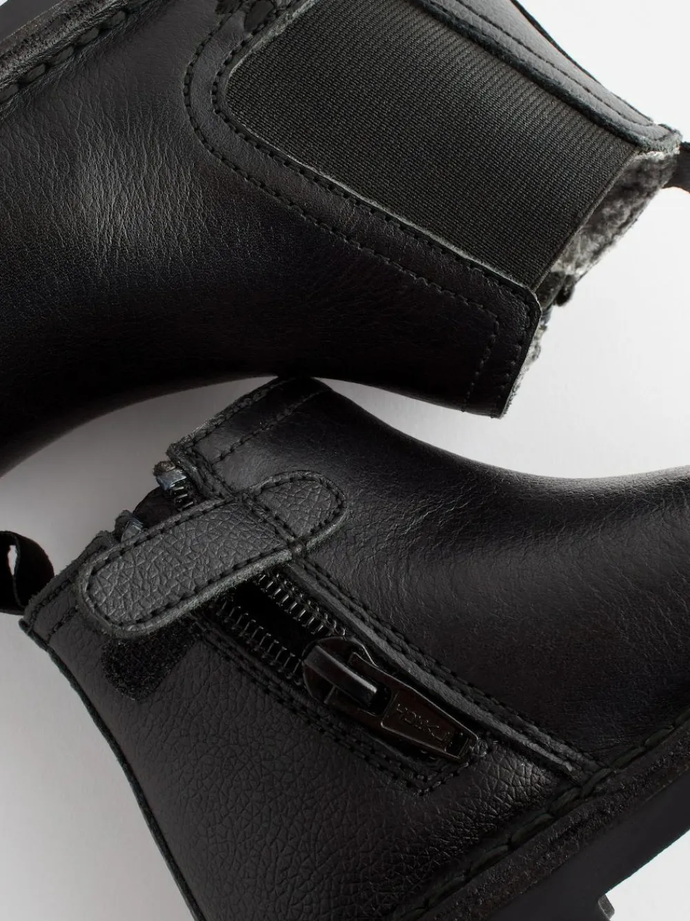 Style your mini-me from the feet up in these adorable warm lined leather Chelsea boots in black. Crafted in beautiful leather with elasticated gusset and inside zip for easy on-off. View the How to Measure and Fit at Home Guide Upper – Leather, Textile, Lining & Sock – Textile, Sole – Other Materials.