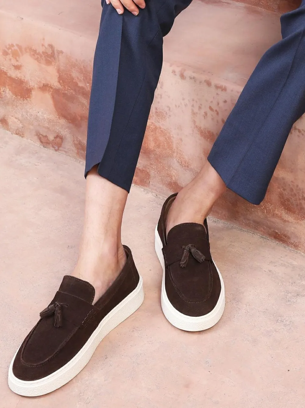 Classic charm meets casual ease in the Rory tassel loafers. Made in rich brown suede, they combine easy slip-on comfort with traditional flair—perfect for weekend outings or laid-back office wear.. Slip-on design with front tassels. Soft brown suede upper. Moc toe stitching for timeless appeal. Lightweight, off-white textured sole. Cushioned insole for added comfort. Put your best foot forward—Rory makes everyday style effortless. Main – 100% Leather. Lining – 100% Other fibres. Sock – 100% Other fibres.