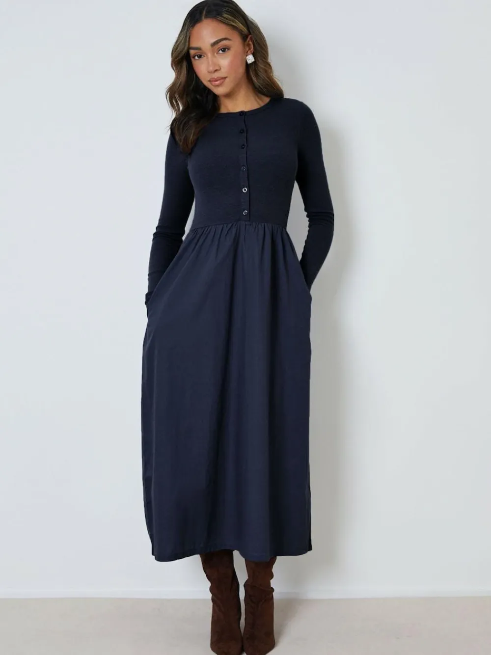 Elevate your style with this jersey poplin mix fab button-down dress from Threadbare. 2-in-1 mix fabric. Ribbed jersey bodice. Crew neck. Long sleeves. Three functional buttons, three fixed. Poplin skirt. Midaxi length. Two side pockets. Model wears UK size 8. Machine washable. Top 47% Cotton, 47% Viscose, 6% Elastane. Skirt 100% Cotton.