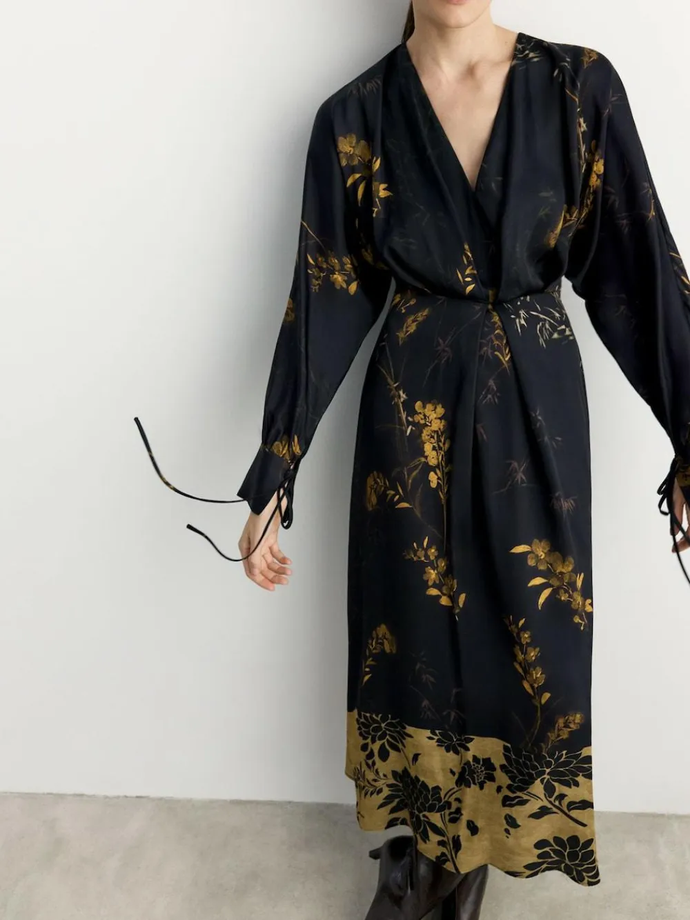 BHOEM Satin Floral Print Kimono Midi Black Dress^Women Occasion Dresses|Midi Dresses