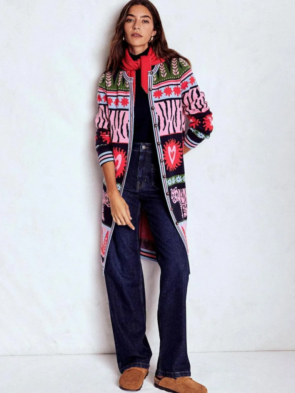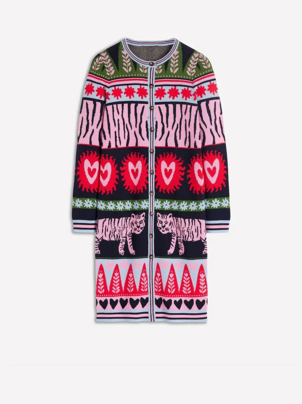 Cardigans are making a comeback and this longline jacquard style will become a mainstay in your wardrobe. The bold fun print is just us. Wait until everyone is saying how it looks made for you. Dry clean only. 50% Cotton, 30% Nylon, 20% Wool.