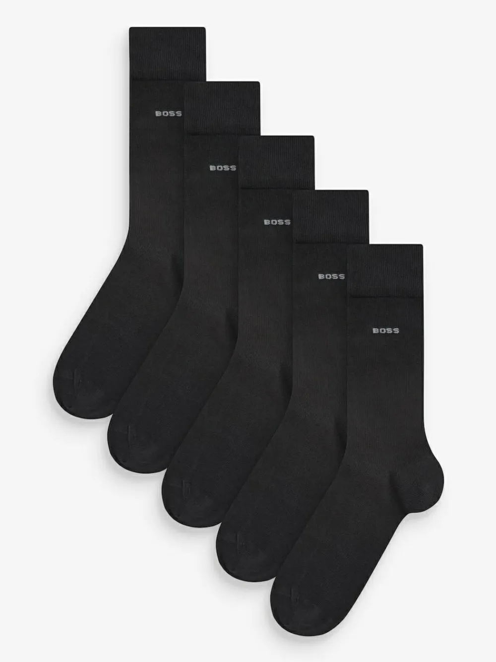 Five pairs of regular-length business Black socks by BOSS. Featuring reinforced stress zones, these socks are crafted in soft yarns that are rich in cotton for everyday comfort. Each pair is detailed with a subtle BOSS logo. 75% Cotton, 23% Polyester, 2% Elastane.