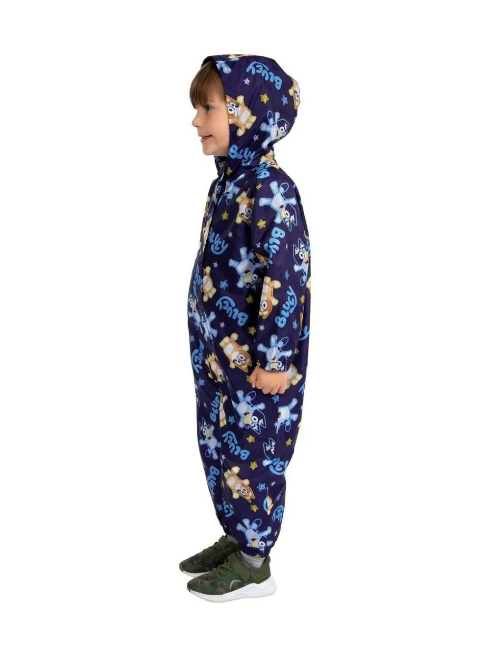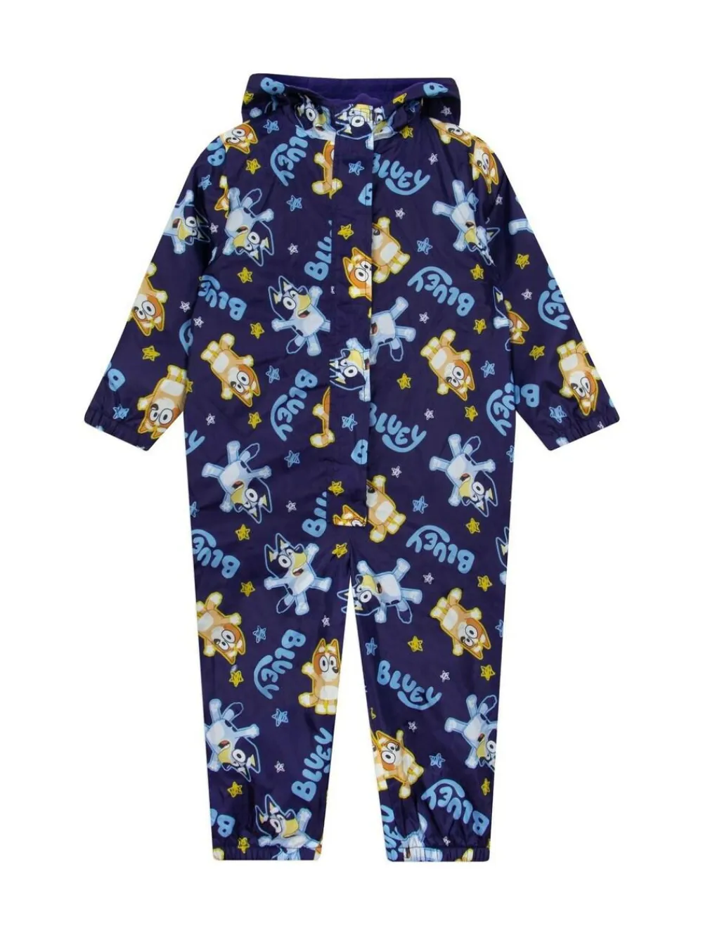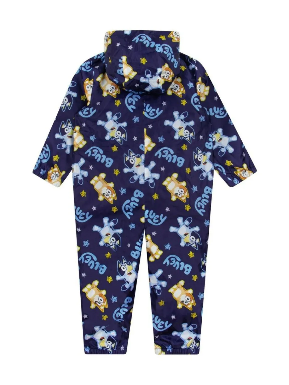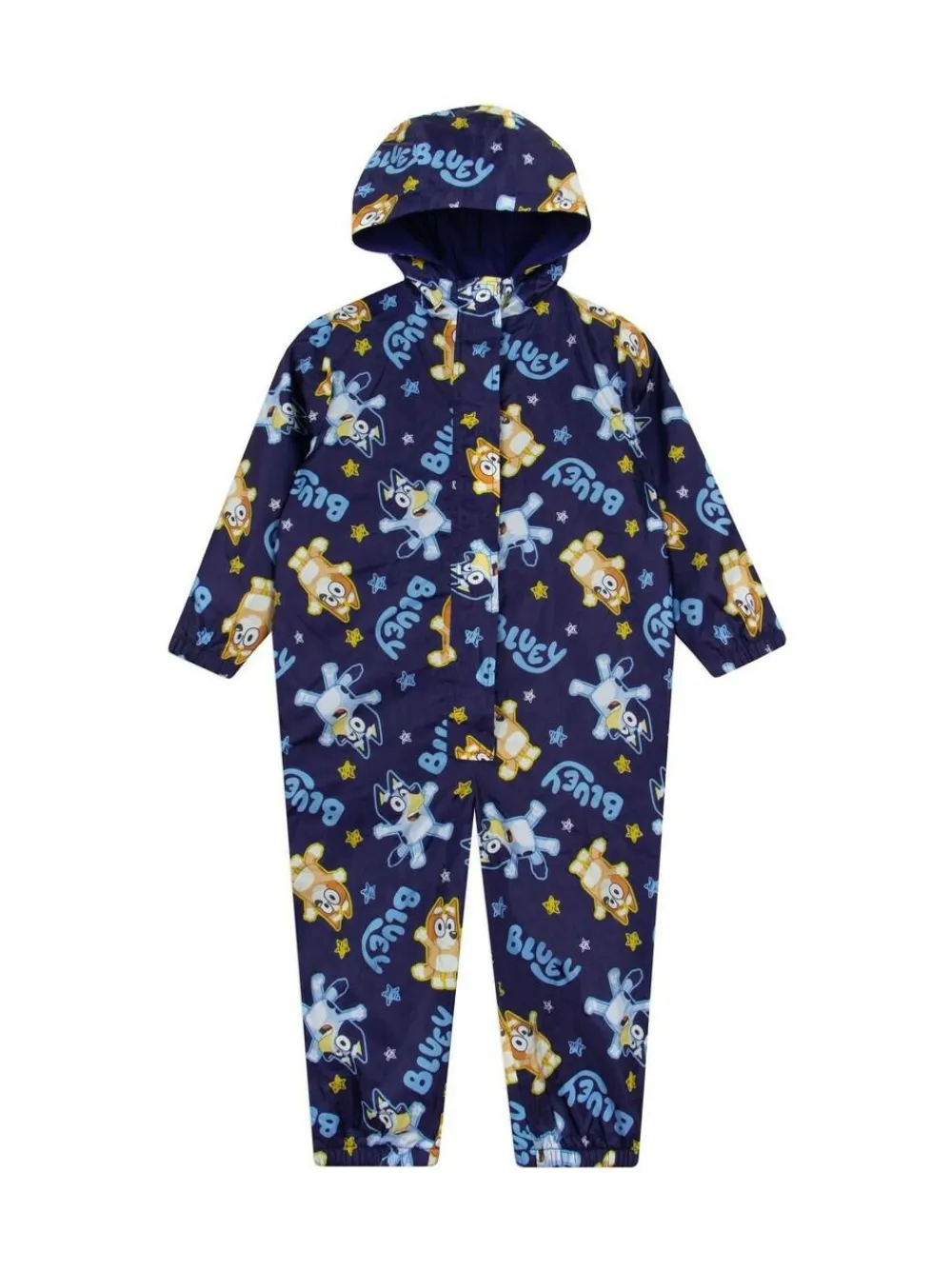 Designed with a fun all-over Bluey and Bingo pattern, this kids puddle suit is a must-have for little adventurers. kids splash suit is lined with soft, warm material, it keeps your child snug while they splash and play. Let your little one dive into puddle-jumping adventures with this adorable navy rain suit featuring Bluey, Bingo, and a playful sprinkle of multicoloured stars. Its cosy lining ensures warmth and comfort, while the vibrant design adds a touch of joy to rainy days. Perfect for outdoor escapades, this boys puddle suit is as practical as it is delightful. Get ready for hours of fun-filled splashes! Machine washable. 100% Polyester.