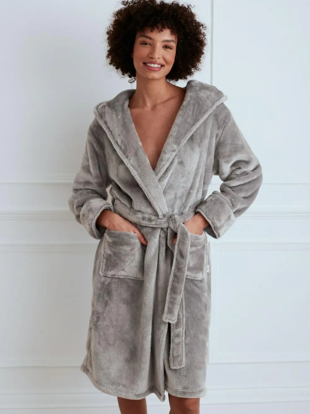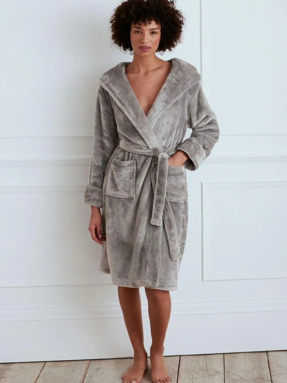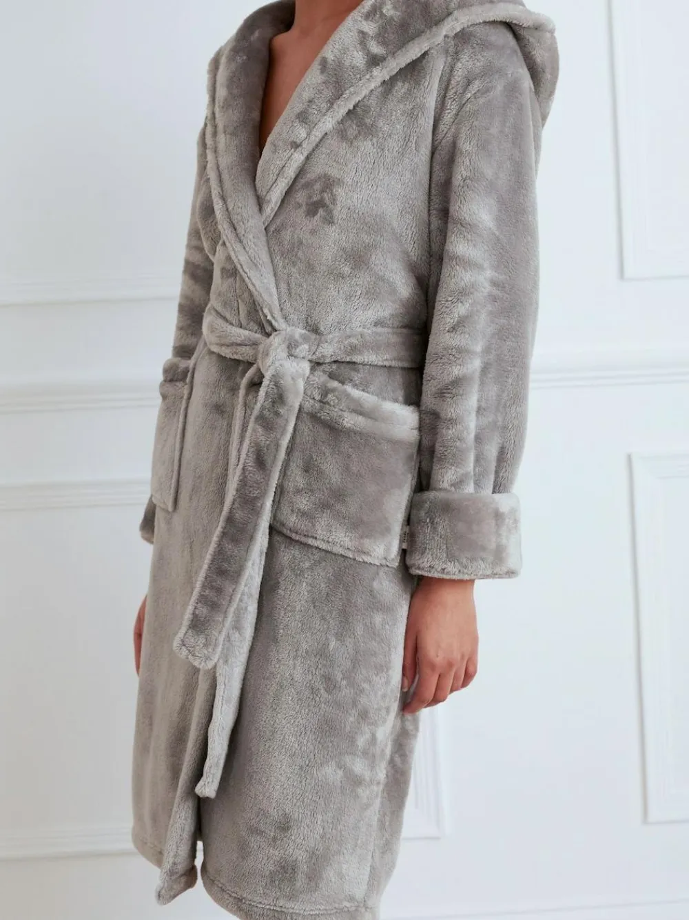 In plush fibre fleece, this soft Charcoal Grey dressing gown features a tie belt and generous hood, a must for all comfort-seekers. Machine washable. 100% Polyester. Warning: Keep away from fire and flames.
