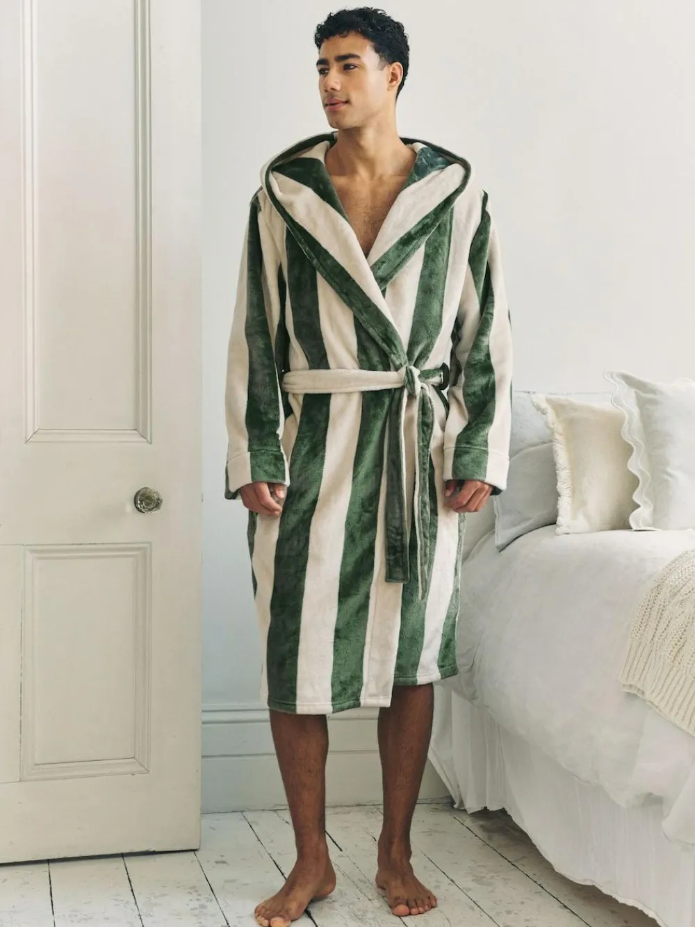 Laid-back, cosy and cut to stand out. This hooded robe is made from thick 300 GSM fleece fabric, bringing heavyweight warmth without the bulk. Finished with a self-tie belt and side pockets, it features bold khaki and cream stripes for a look that feels fresh, not fussy. Whether it s your morning brew or late-night wind-down, this robe’s got you covered. Machine washable. 100% Polyester.