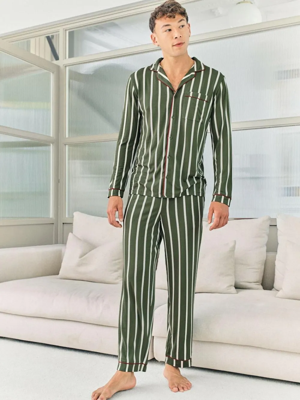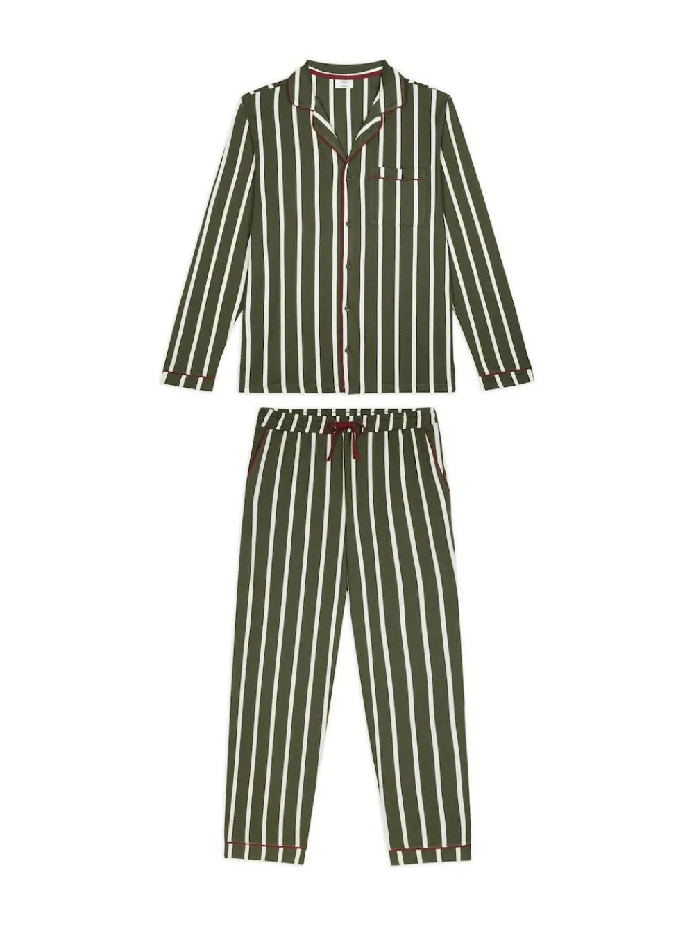 Easy comfort meets classic style. This full-length pyjamas set is made from soft fibre jersey in khaki and white vertical stripes, finished with contrast piping for a polished look. The revere collar shirt features a button-up front and chest pocket, while the matching bottoms come with an elasticated waistband and side pockets for a relaxed fit that moves with you. Timeless, understated and seriously soft – made for lie-ins, wind-downs and everything in between. Machine washable. 95% Polyester, 5% Elastane.