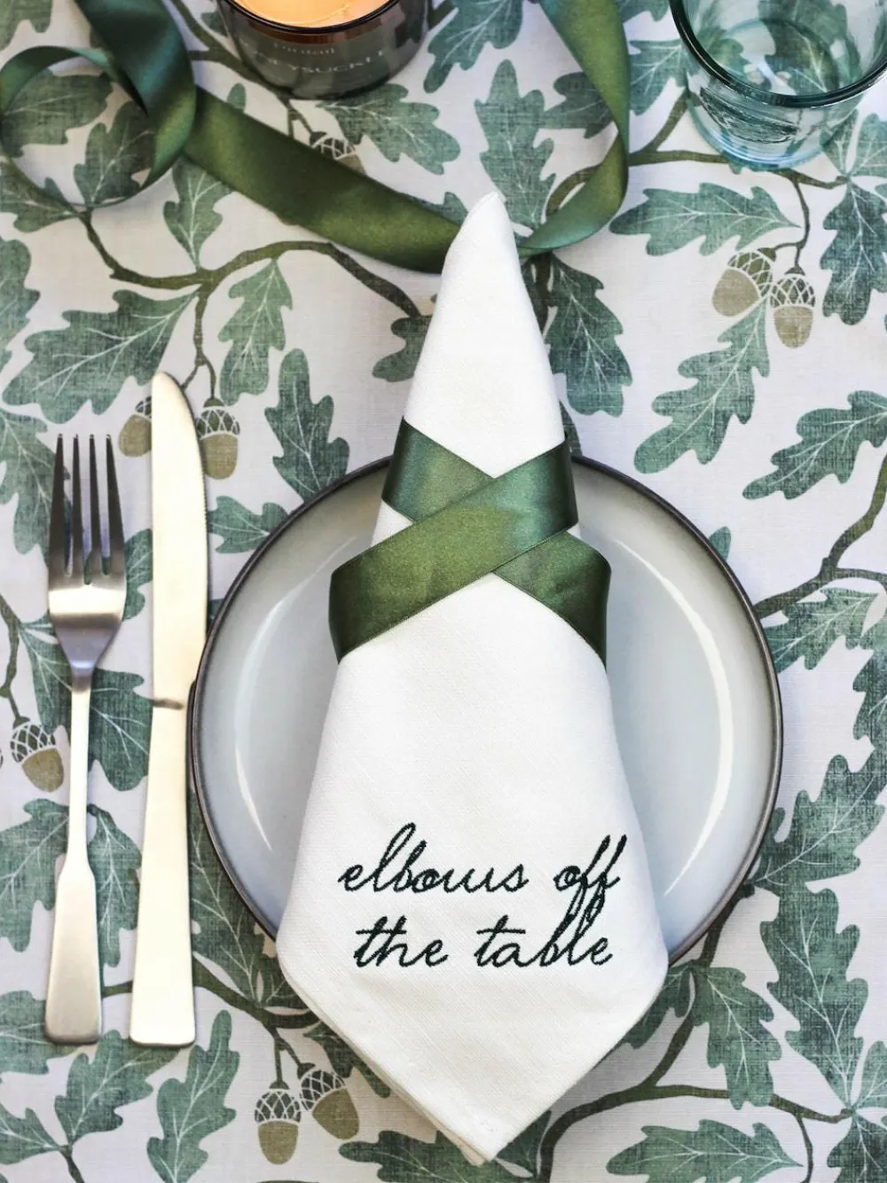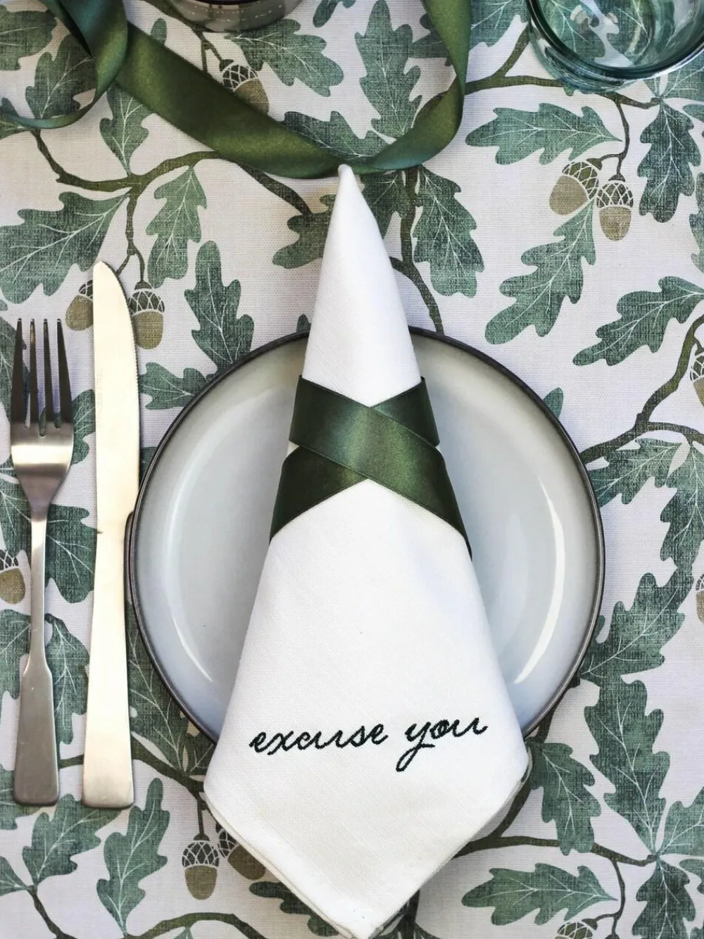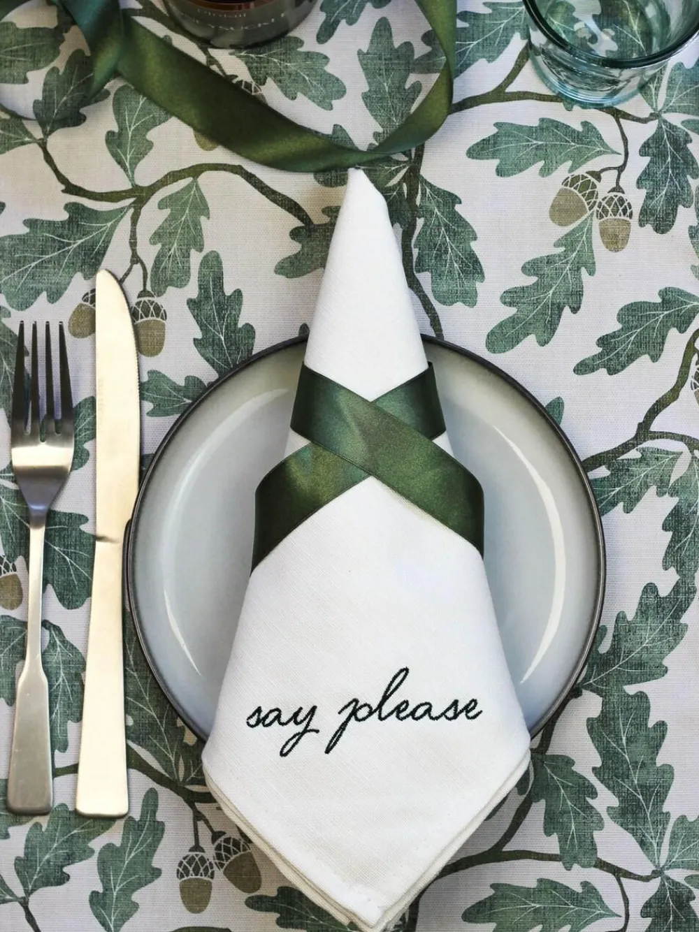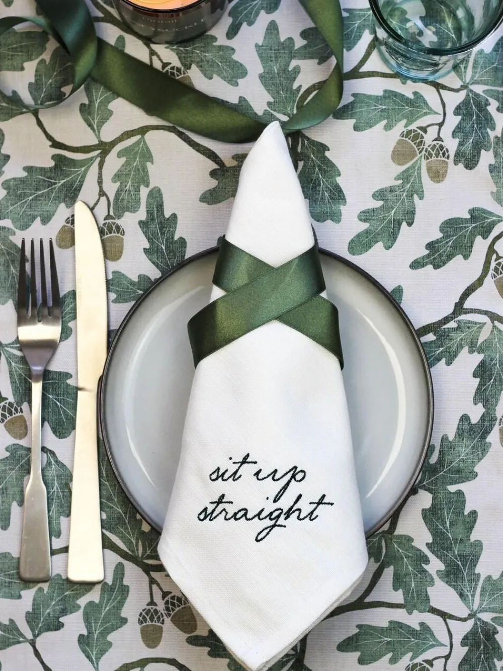 Get your act together with this tongue-in-cheek gift set, with each napkin featuring one of the following phrases to help keep your guests, your friends or maybe even yourself on your best behaviour… – Sit up straight – Elbows off the table – Say please – Excuse you Made in the UK by our team of Lake District artisans and presented in our beautiful Avalon Home gift box, these linen-cotton napkins each measure 50x50cm and come in a natural colour with rich green embroidery. Length 23.5cm Width 23.5cm Washable. 100% Cotton.