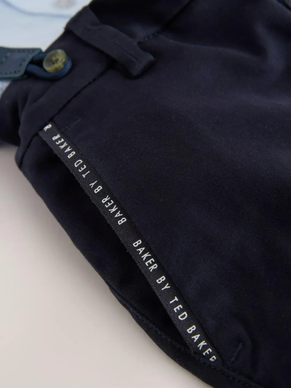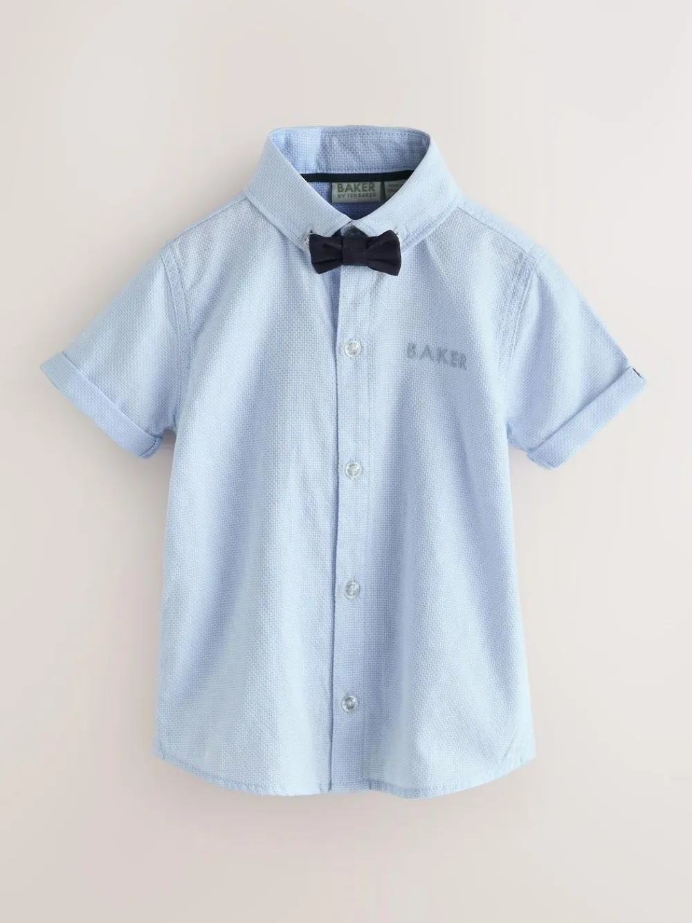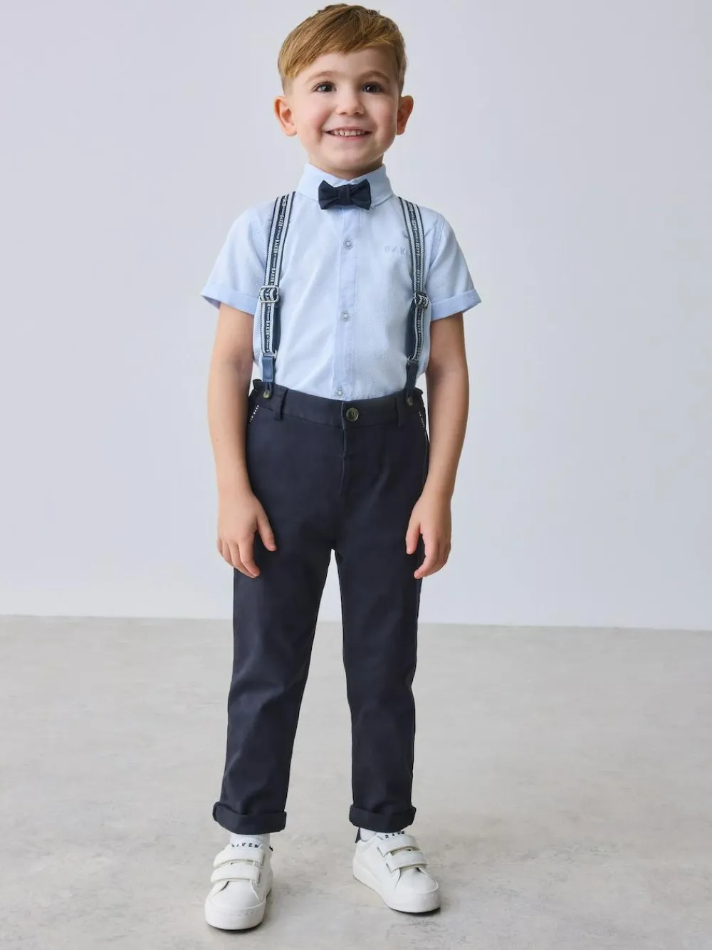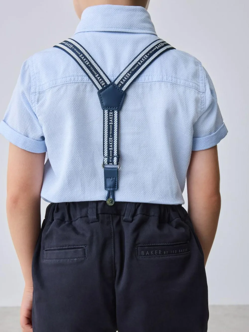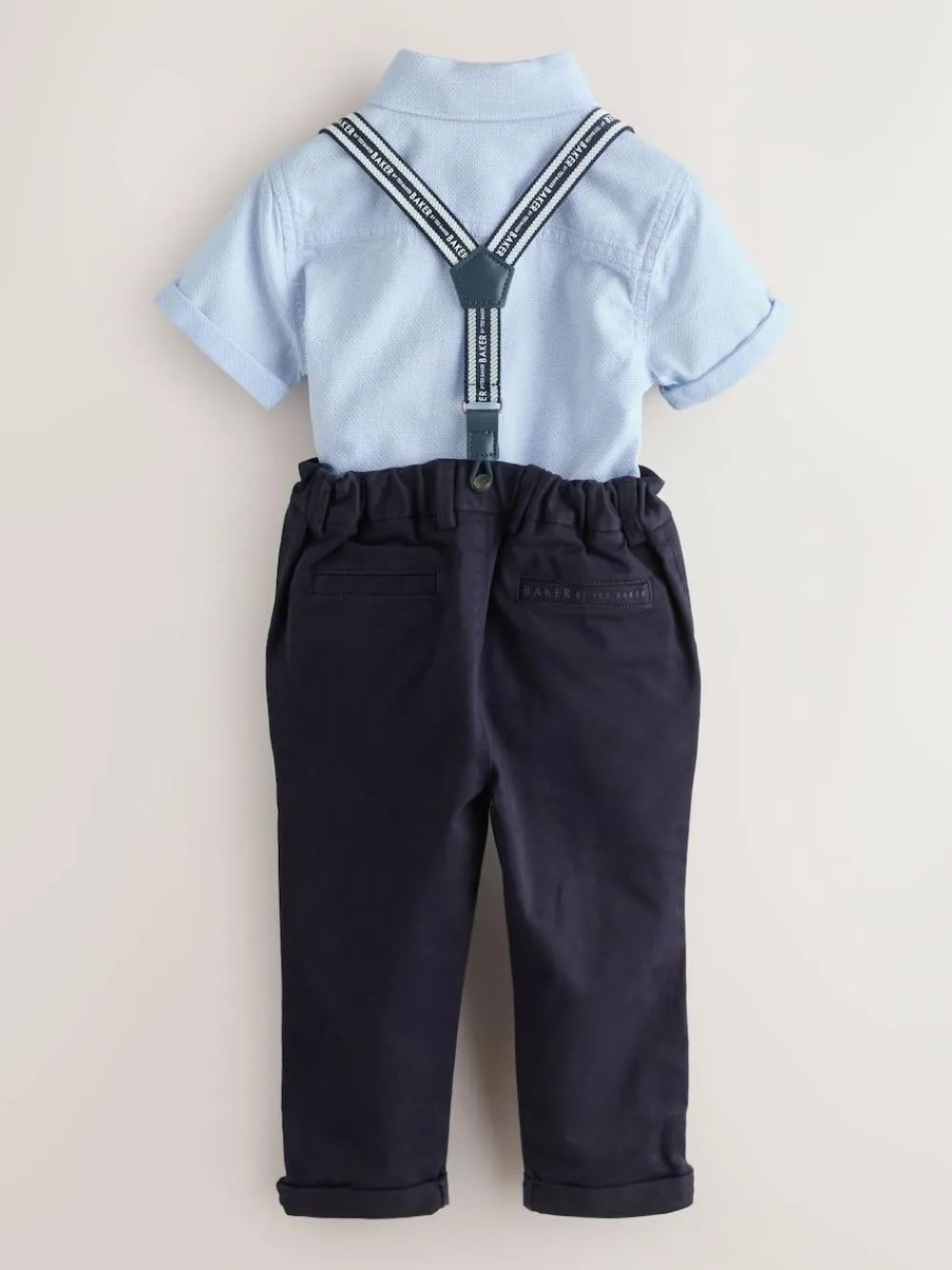 Elevate their formal wardrobe with the Baker by Ted Baker Shirt, Trousers and Braces Set, a sophisticated four-piece ensemble designed for special celebrations. This coordinated outfit features a crisp blue short-sleeve shirt accented with subtle branded embroidery on the chest, paired with a matching navy bow tie for a polished look. The set includes navy chinos detailed with stylish tape accents on the pockets and classic turn-ups at the trouser hems. To complete the traditional look, the ensemble is finished with coordinated braces featuring branded tape, ensuring they look dapper for any occasion. 4 piece set Branded embroidery Turn-up hems Matching bow tie and braces Shirt 100% Cotton. Trouser and Bow Tie 98% Cotton, 2% Elastane.