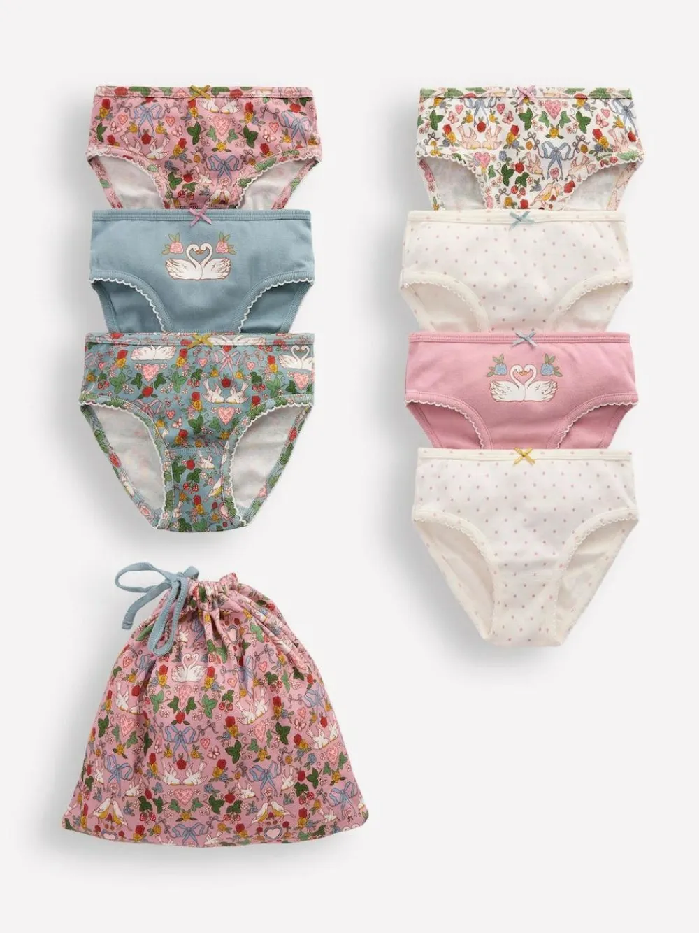 A handy set with a pair of comfy cotton pants for every day of the week finished with a bow and a cute cotton bag to keep them safe. Machine washable. 100% Cotton.