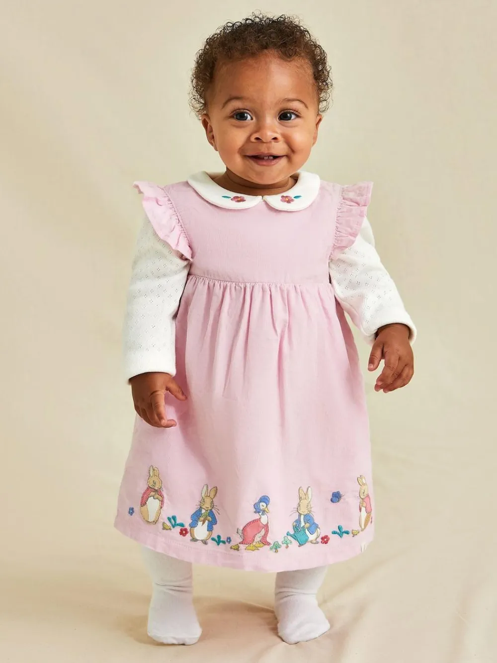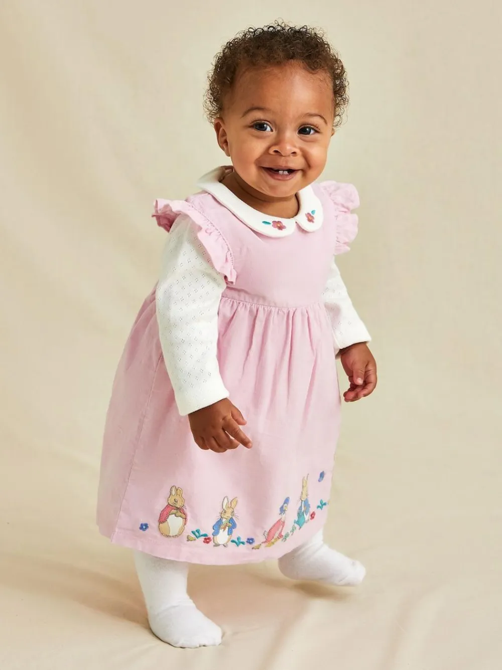 For the littlest twirlers… this Peter Rabbit Embroidered Baby Dress & Body Set is perfect for everyday adventures or dressing-up days. With frilled sleeves and delicately embroidered Peter Rabbit characters lining the bottom of the dress, as well as the classic Peter Pan collar and long sleeves of the soft body suit, this charming outfit is guaranteed to keep your bouncy bundle of joy so-so comfy and as stylish as ever. 2-piece set includes a pink dress and a white patterned body suit Peter Rabbit embroidery Frilled sleeves Classic Peter Pan collar on the body suit Poppers to legs for easy nappy changes MAIN: 100% Cotton, OTHER: 95% Cotton, 5% Elastane Machine washable Main 100% Cotton. Body 100% Cotton. Trim 95% Cotton, 5% Elastane.