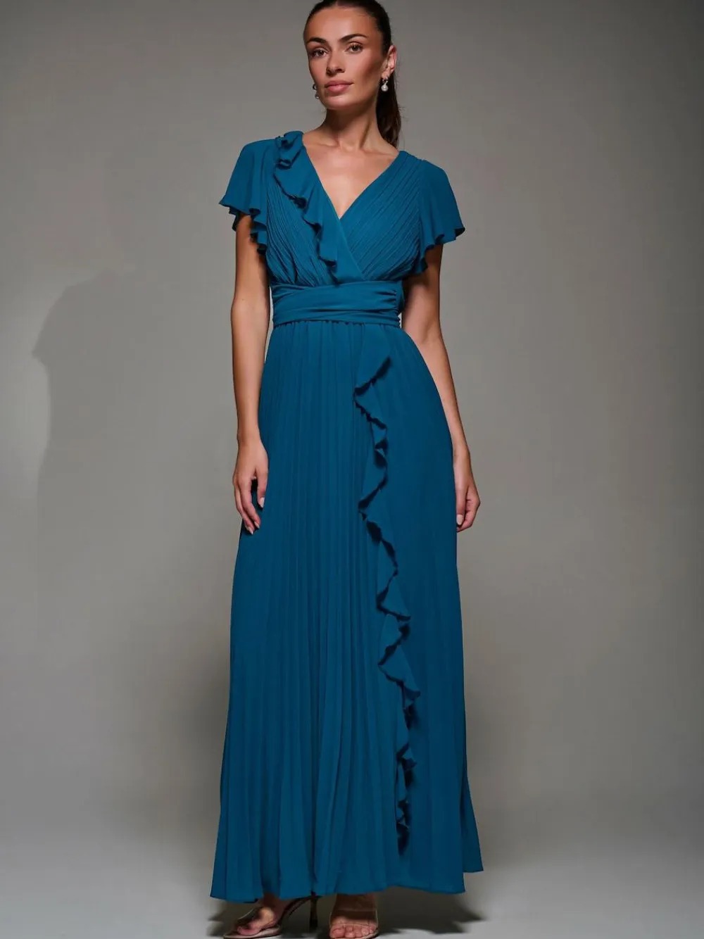 The Pleated Frill Detail Chiffon Maxi Dress by Jolie Moi is made from delicate chiffon and fully lined for comfort. It features frill short sleeves and a frill crossover neckline that extends down the back of the dress. The skirt is pleated for graceful movement, and a tie detail at the back adds a finishing touch. Machine washable. 100% Polyester.