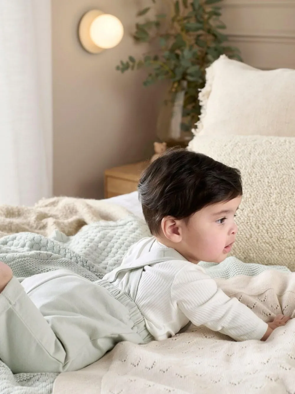 The perfect coming home collection, this beautiful range of timeless quality newborn clothing is designed to nurture your little one. Welcome to the World brings together gentle materials with relaxed fits, in comfortable clothing for baby during their first weeks in the world. 2-piece set. Includes rib bodysuit with envelope neck and popper crotch for easy changing. Pairs with super soft jersey dungaree with mock wood buttons on straps for adjustable fit, elasticated waist and concealed poppers at crotch for easy changing. A gorgeous complete outfit!Full Washing Instructions: 40 degree wash, do not bleach, cool tumble dry, cool iron, do not dry clean, wash dark colours separately, iron on reverse.’ Machine washable. Body 95% Cotton, 5% Elastane. Outer 100% Cotton.