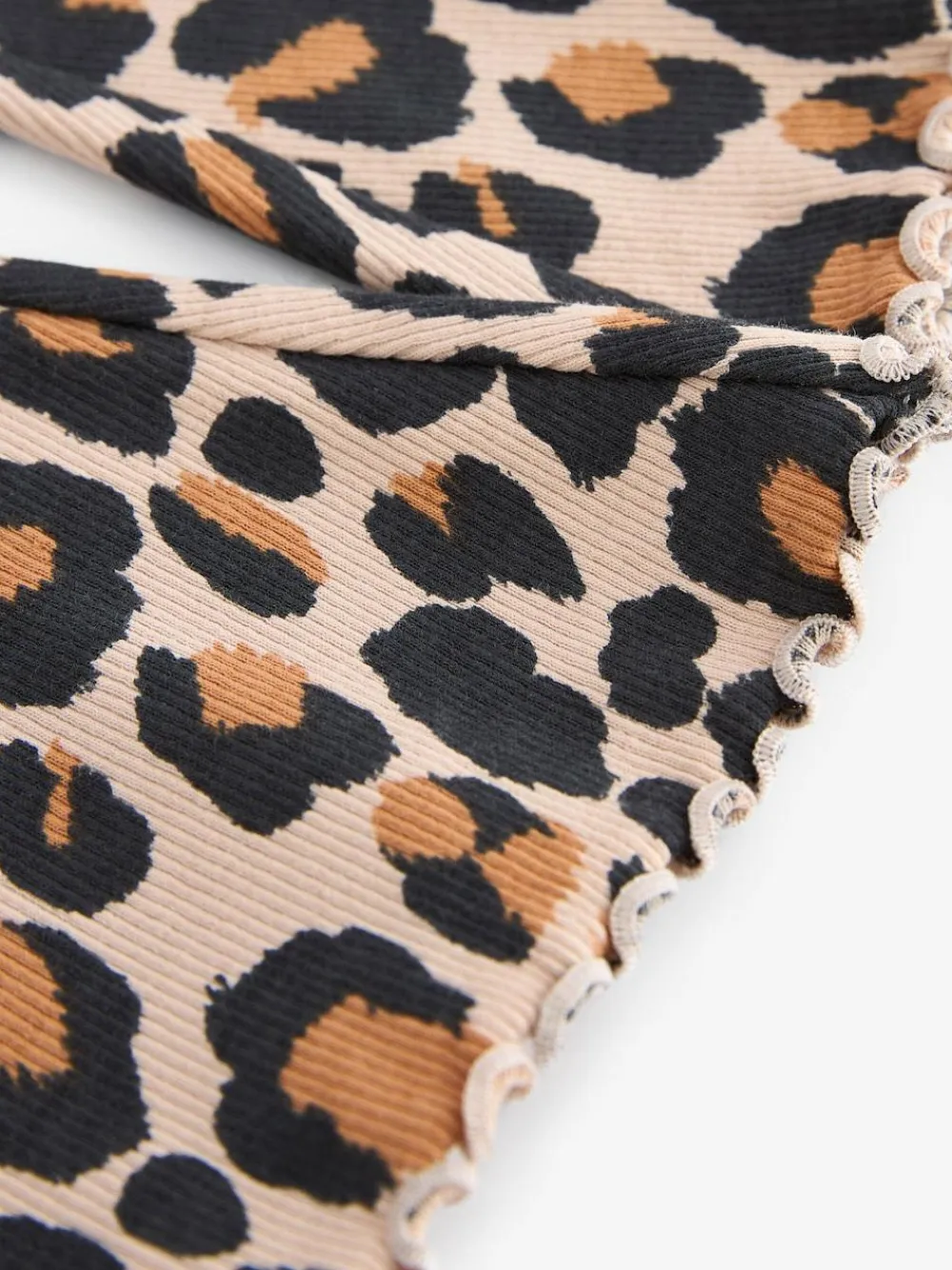 Level-up her everyday looks with our leopard print rib flare leggings. Made from a cotton rich blend for added comfort and finely finished with lettuce trim edges, an elasticated waistband amd ribbed detailing. Ribbed cotton stretch fabric Elasticated waistband Pull-On style Wide-leg shape Lettuce trim edges Machine washable. 95% Cotton, 5% Elastane.