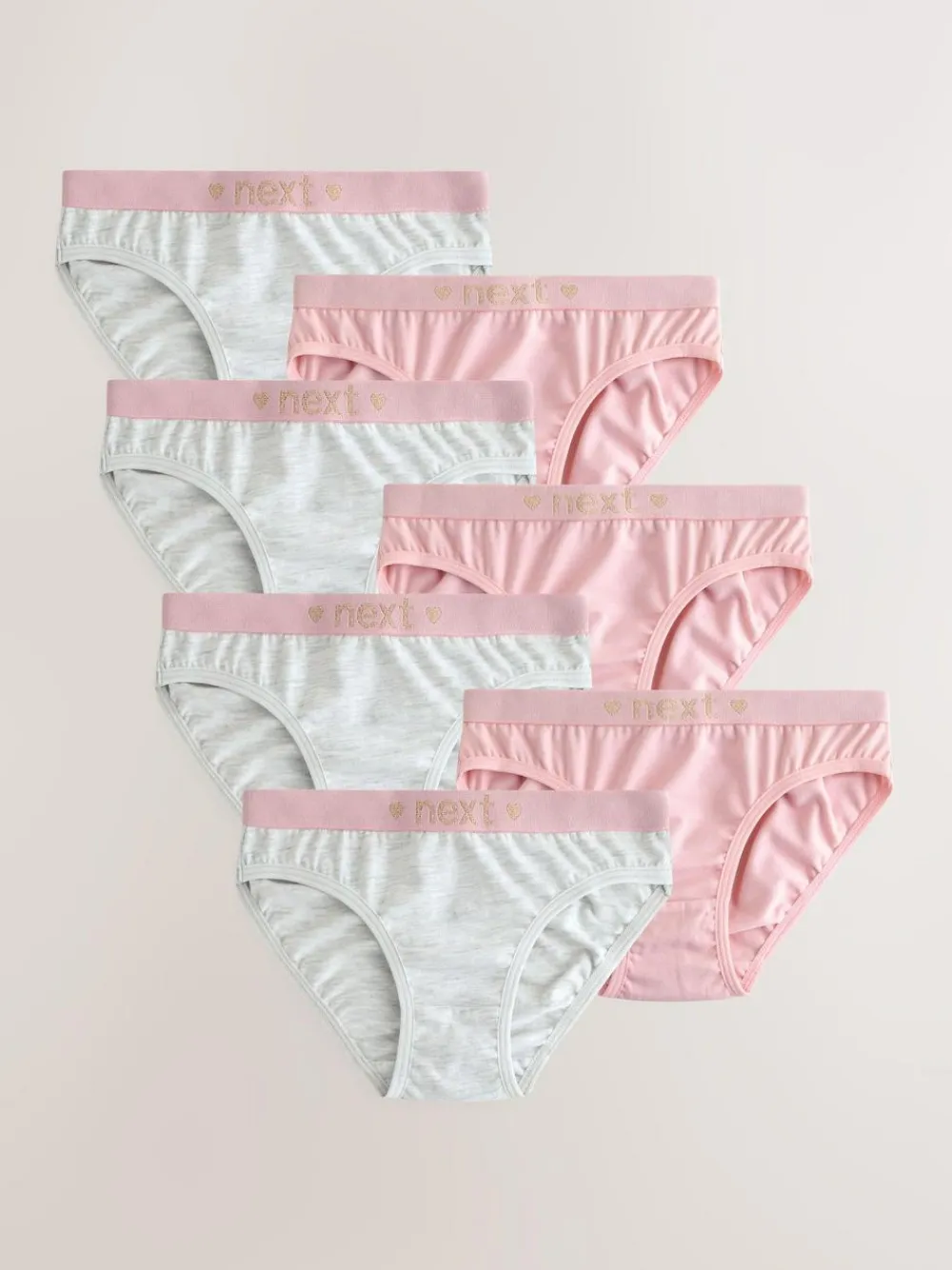 Our 7 pack of bikini brief has a high rise, high leg shape with a narrow side seams, a double layered gusset and elasticated trims with Next branding. In a supersoft cotton with added stretch for comfort and shape retention after washing. Perfect for stocking up on everyday essentials. Pack of 7 Cotton rich High leg shape Elasticated waistband Machine washable. 5 x Briefs 95% Cotton, 5% LYCRA® XTRA LIFE™ elastane. 2 x Briefs GREY MARL 94% Cotton, 5% LYCRA® XTRA LIFE™ elastane, 1% Viscose.