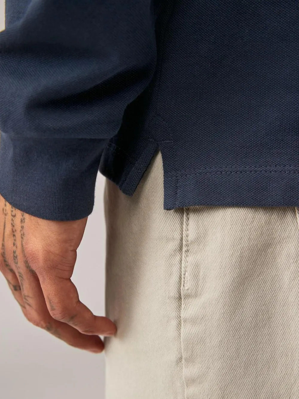 Unlock preppy and put-together style with our navy blue long sleeve pique polo shirt. Designed with a classic buttoned placket in a regular, smart fit. This piece is a core wardrobe essential. Pique polo shirt Long sleeves Regular fit Core wardrobe staple Machine washable. 95% Cotton, 5% Elastane.