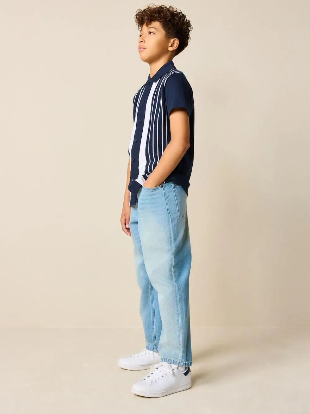 Upgrade his smart-casual rotation with this stylish navy and white vertical stripe jersey shirt, designed for ages 3-16 years. Crafted from soft 100% cotton for breathable comfort throughout the day, it features a classic button-through front and short sleeves, making it a versatile choice for warmer weather or layering. Button through fastening Soft 100% cotton fabric Jersey construction Short sleeve design Machine washable. 100% Cotton.