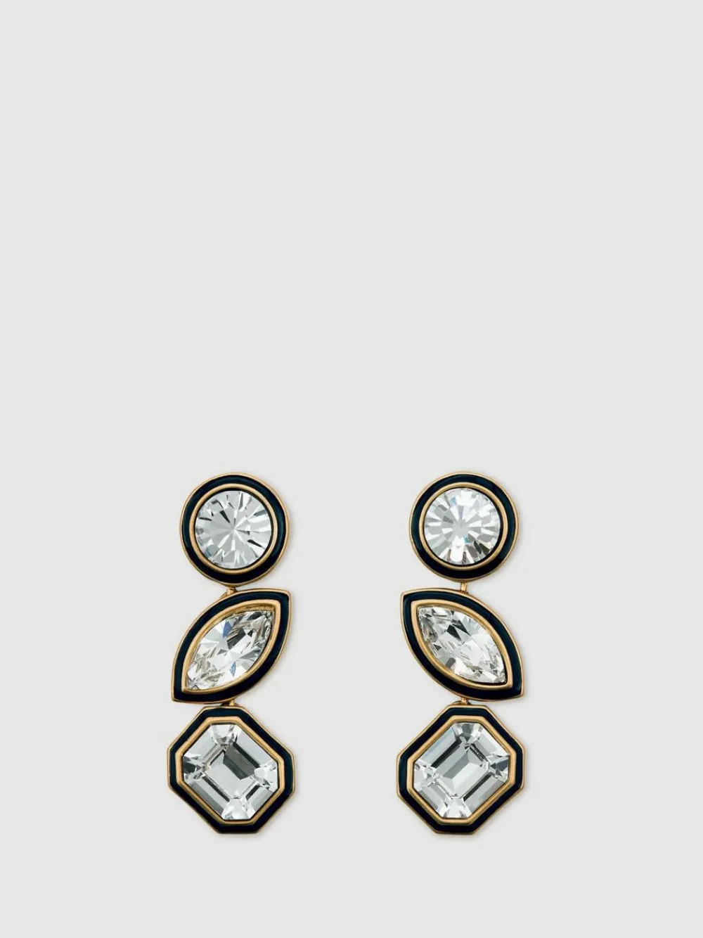 The Crista drop earrings lend refined glamour to evening looks. A trio of European-cut crystals—round, almond, and cushion—is suspended in a gold-tone setting with bold black enamel borders, creating a modern contrast with vintage-inspired sparkle. Fine European crystals Gold-tone plating Hypoallergenic posts and secure earring backs For pierced ears Matching items available Presented in a Reiss-branded gift box Care Instructions: To keep your Reiss jewellery looking its best, put it on last after applying perfumes or sprays. Steer clear of water, lotions, and chemicals. Use only a soft cloth for cleaning—skip the chemicals and polishing liquids. Store it in the packaging it came in. And don’t forget: Make it the last thing you put on in the morning and the first thing you take off in the evening. The model is wearing a size 8. Measurements of model: 5ft9′ / 175cm. Length 4.5cm Width 1.5cm 53% Brass, 45% Crystal, 2% Stainless steel.