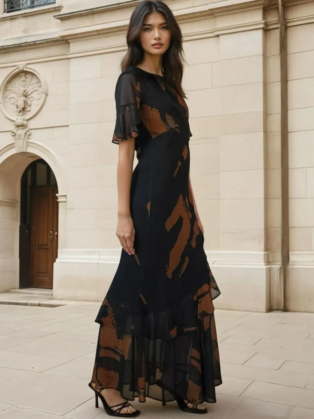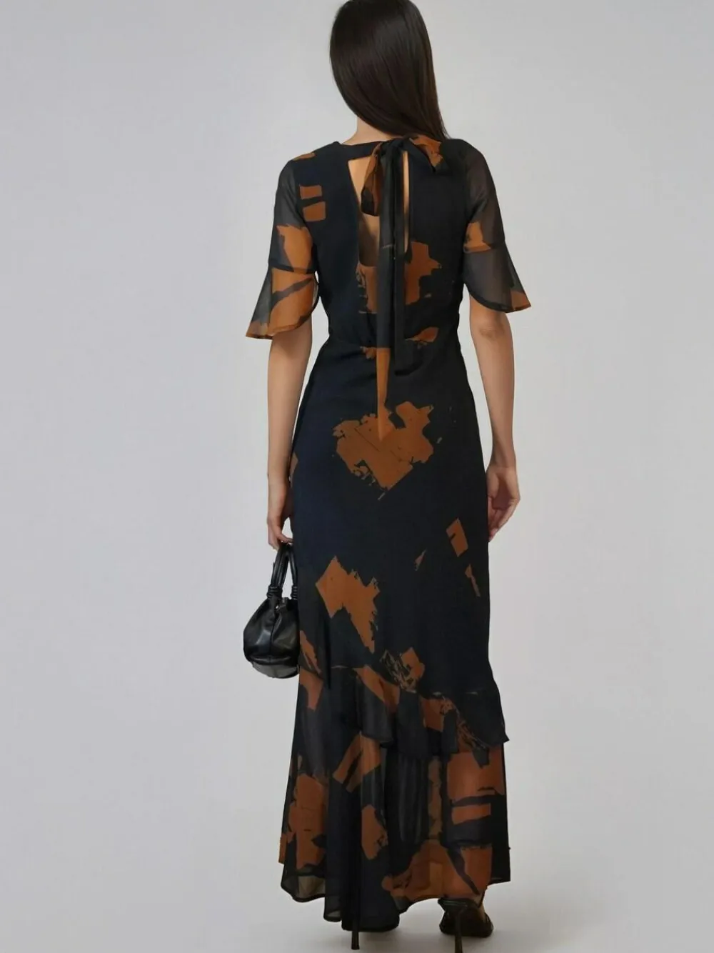 The Liv maxi dress is a modest yet flattering occasion piece designed with a fitted bodice and slim silhouette, enhanced by playful frills at the sleeves and across the skirt. Crafted in our abstract Facade print in a warm brown and black palette, it features an elasticated back detail for comfort and ease of movement, making it both elegant and styled. The Liv maxi dress features a fitted waist and a gathered neckline with a bow tie back detail for an elegant look. The model wears a size 10. Length from the top: 142 cm Regular side neck to hem 56″ / 142cm. Machine washable. Main 100% Polyester. Lining 100% Viscose.