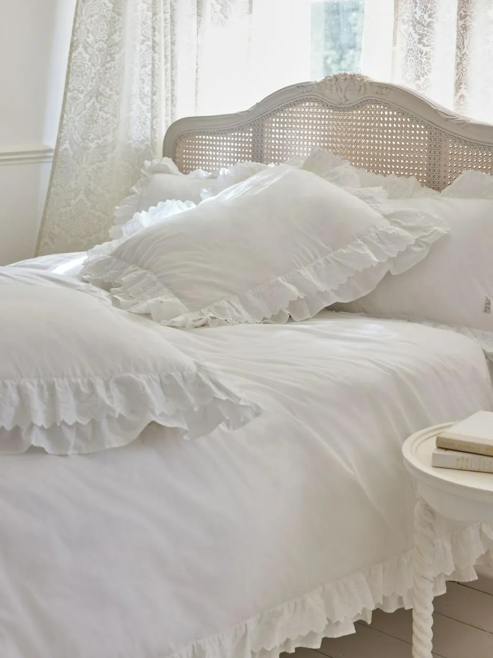 This classic white ruffled Broderie Anglaise pillowcase set by Shabby Chic by Rachel Ashwell® is a beautiful accent for any bedroom. Featuring delicate eyelet broiderie and ruffled trims, this elevated pillowcase pair withholds a quintessential Shabby Chic by Rachel Ashwell® relaxed look. Made in 200 thread count 100% Cotton Percale, this set is designed to seamlessly mix and match with the other Shabby Chic by Rachel Ashwell® bed linen styles. Oxford: 50x75cmSquare: 65x65cm Machine washable. 100% Cotton