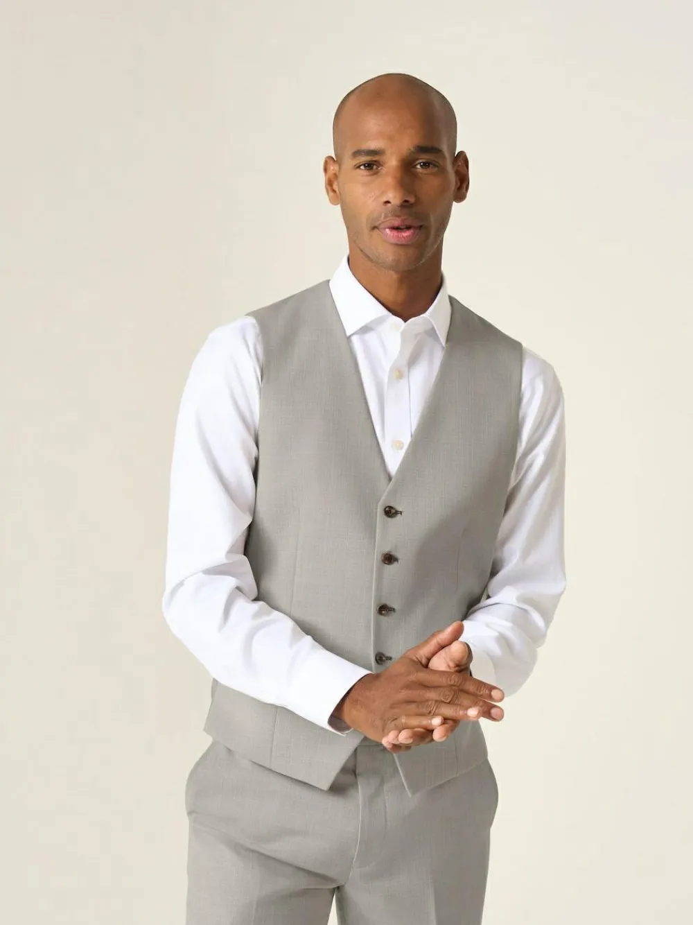 I’m Redding, a single-breasted Natural suit waistcoat cut from a sky-blue cloth. It comes complete with horn-effect buttons, an adjustable back strap, and welted outer pockets. Wear me with my matching Redding suit jacket and trousers and get the party started. I go well with light-toned accessories for summer. See my matching tailored jacket and trousers to complete the look or wear me under a darker blue or navy suit for an extra touch of individuality. Dry clean only 63% polyester 34% viscose 3% elastane Dry clean only. 63% Polyester, 34% Viscose, 3% Elastane.