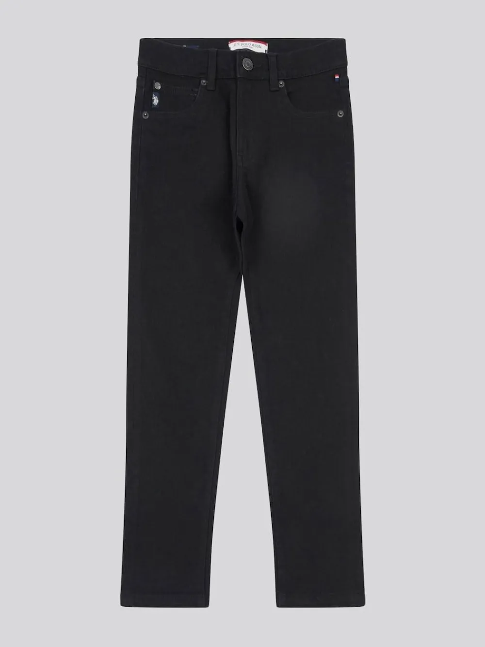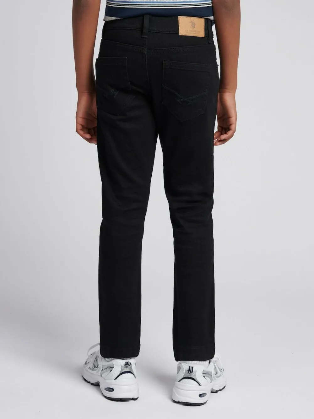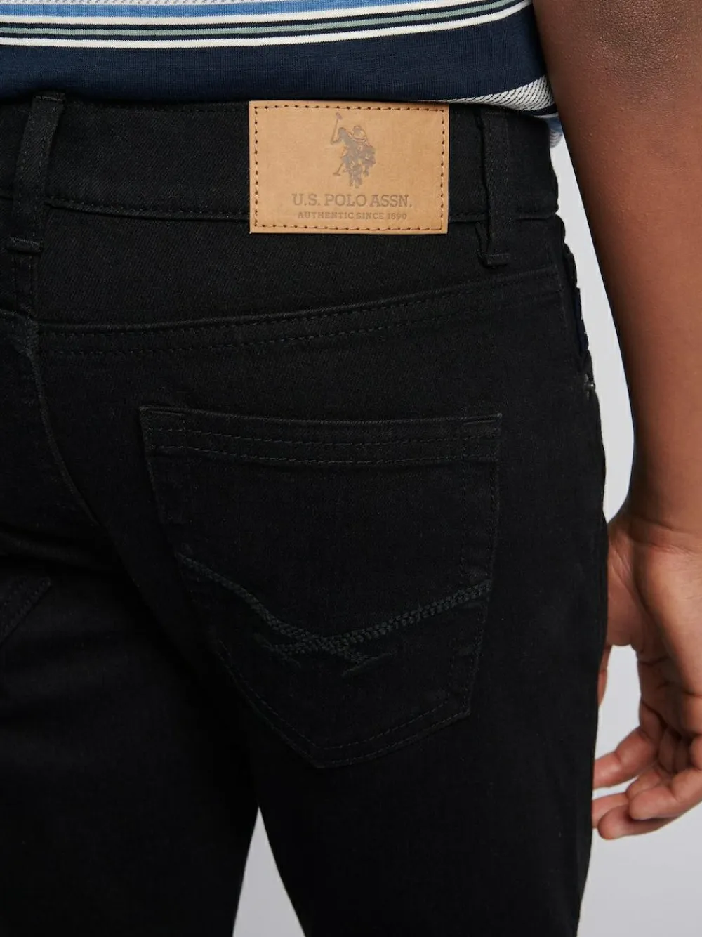 These U.S. Polo Assn. Boys Classic Fit Black Jeans combine timeless design with everyday comfort. Crafted from stretch denim for flexibility and featuring an adjustable waistband, they ensure a perfect fit as he grows. The five-pocket design and subtle embroidered logo add classic styling, making these jeans ideal for pairing with polos or casual shirts. Machine washable. 98% Cotton, 2% Elastane.