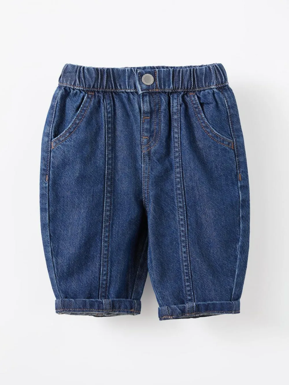 Classic denim fabric – Regular fit and straight leg shaping – Adjustable waistband – Curved side pocket – Added back patch pocket. Machine washable. 100% Cotton.