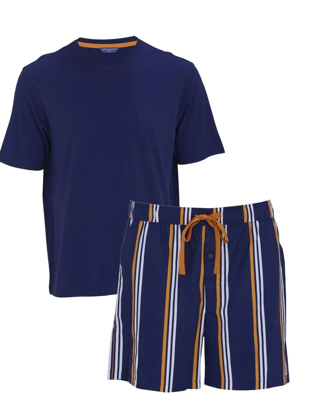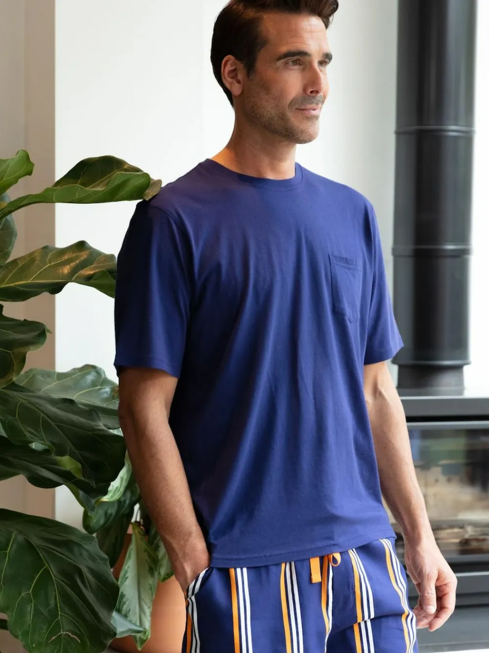 The Navy jersey T-Shirt and printed stripe Shorty set is trimmed with Orange twill tape. The jersey T-Shirt is made from super-soft 50% cotton and modal, has a round collar, short sleeves, a single-shaped pocket, and an orange twill tape back neck tape. The shorts are made from super-soft 60% cotton modal, fully elasticated at the waist with an orange twill tape and an adjustable front drawstring. They feature a functional fly with Navy buttons attached with contrast orange stitching, two slanted side pockets, and a straight bottom hem. Machine washable. Main 50% Cotton, 50% Modal. Lining 60% Cotton, 40% Modal.