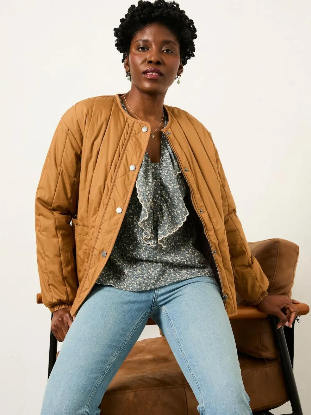 Our Carly blouse is all about soft structure and standout detail. Designed with a ruffled V-neckline and scalloped edges, it’s finished with gathered sleeves and matching trim at the cuffs for a touch of texture. A lightweight layer that lifts any look – style it with denim for everyday ease or tuck it into tailored trousers for something more polished. Machine washable. Main 100% Cotton. Lace 100% Cotton. Embroidery 100% Polyester.